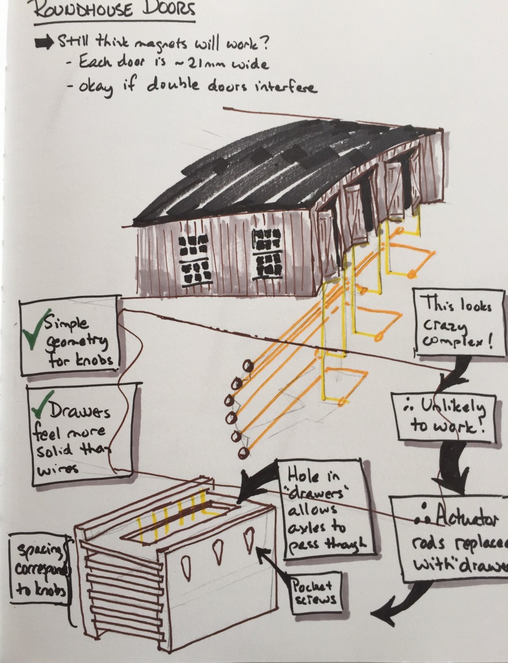 I’ve been pondering the roundhouse doors for a couple of days. Earlier this year, I came up with the idea to drive the doors with magnets beneath the layout.  However, the tangle of rods and levers beneath the baseboard was hard to visualize. So today, I thought I would sketch it out. It still looks too complex to work nicely.