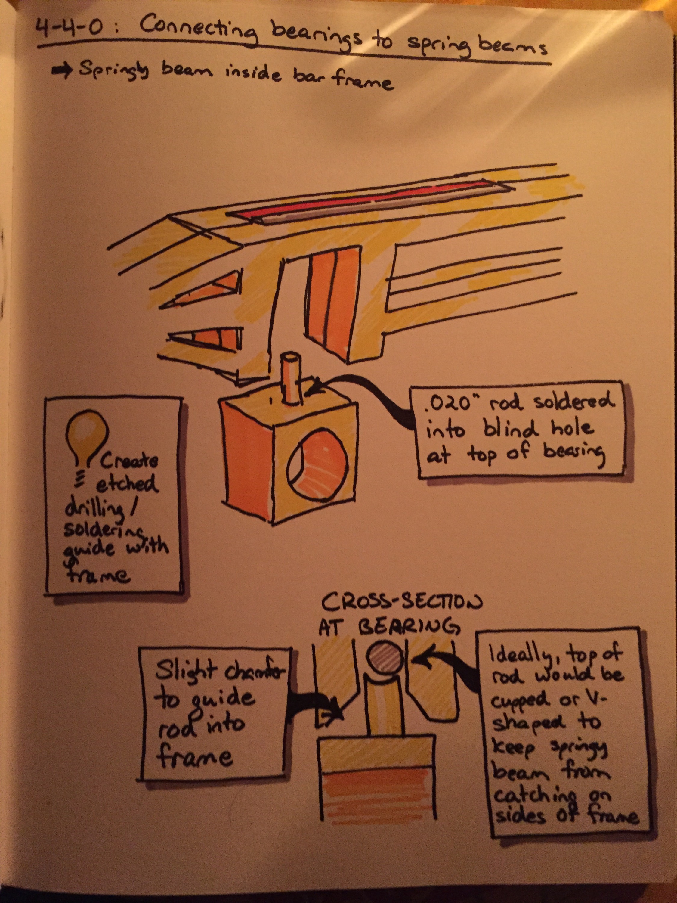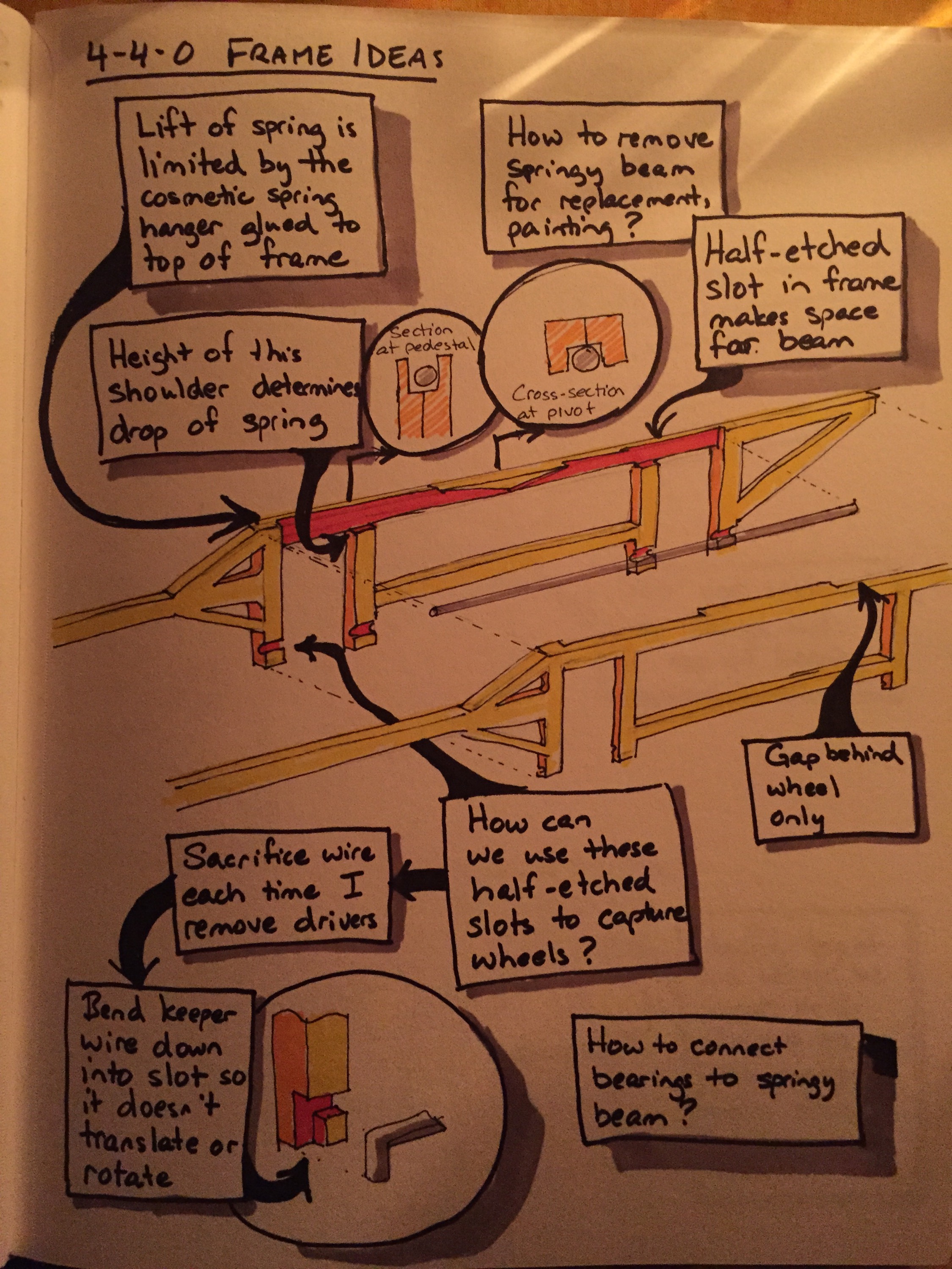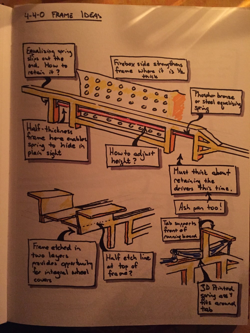 It starts with the frame. On #10, i equalized the drivers inside the firebox. The beams and fulcrums took up space that would have been better filled with lead. So this time I will attempt to push the equalizing beams outside the firebox and into rebates in the bar frames. The pages of my notebook illustrate the idea (note the photos were taken by candlelight, hence the weird shadows).