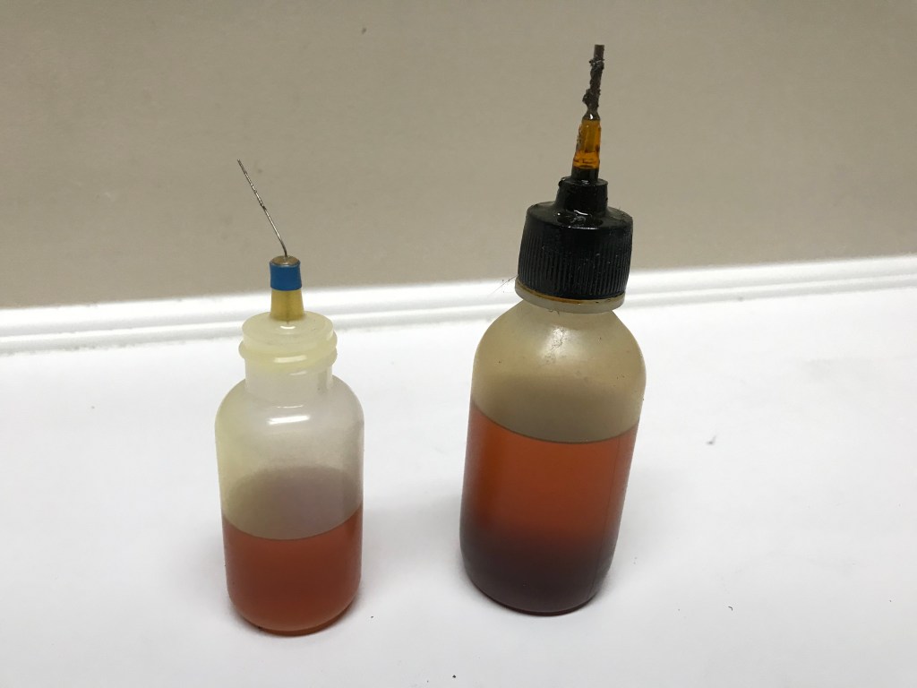 As I was parting wheel number 6, reaching the limit of the reach of my brush into the slot, I remembered that I used to use a bottle from A-West (or was it A-Line, I can’t remember but Flex-i-file makes a similar product) for solvent-type glues. This bottle has a syringe-like tube for applying tiny drops of solvent.