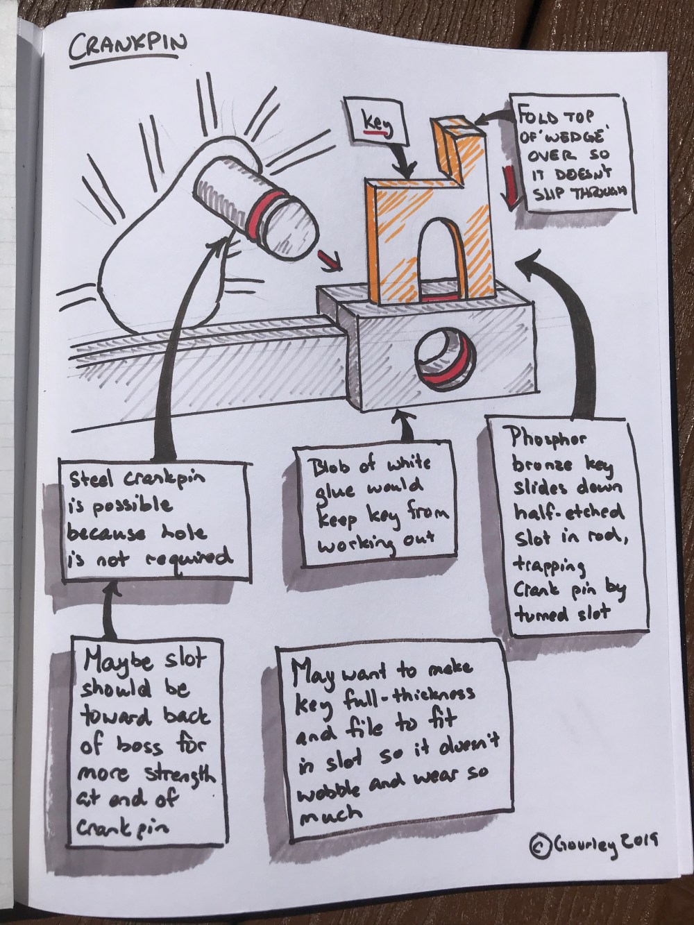Beautiful summer weather rarely inspires much railway modelling. It’s a better time to sit on the deck and enjoy the outside of the house than the inside of the basement. Today the idea book came with me so I could capture that elegant crankpin solution I suggested a month or so ago.