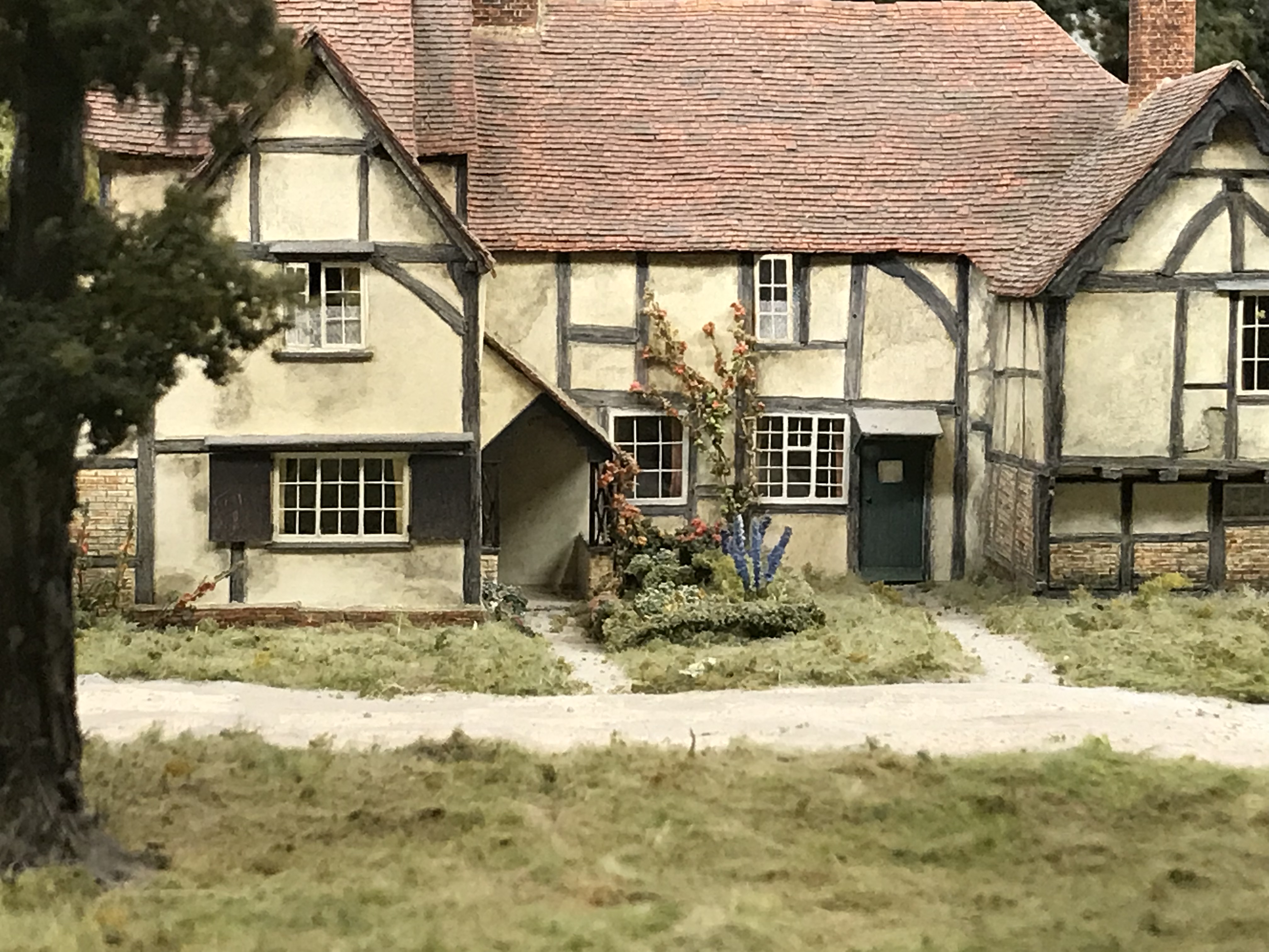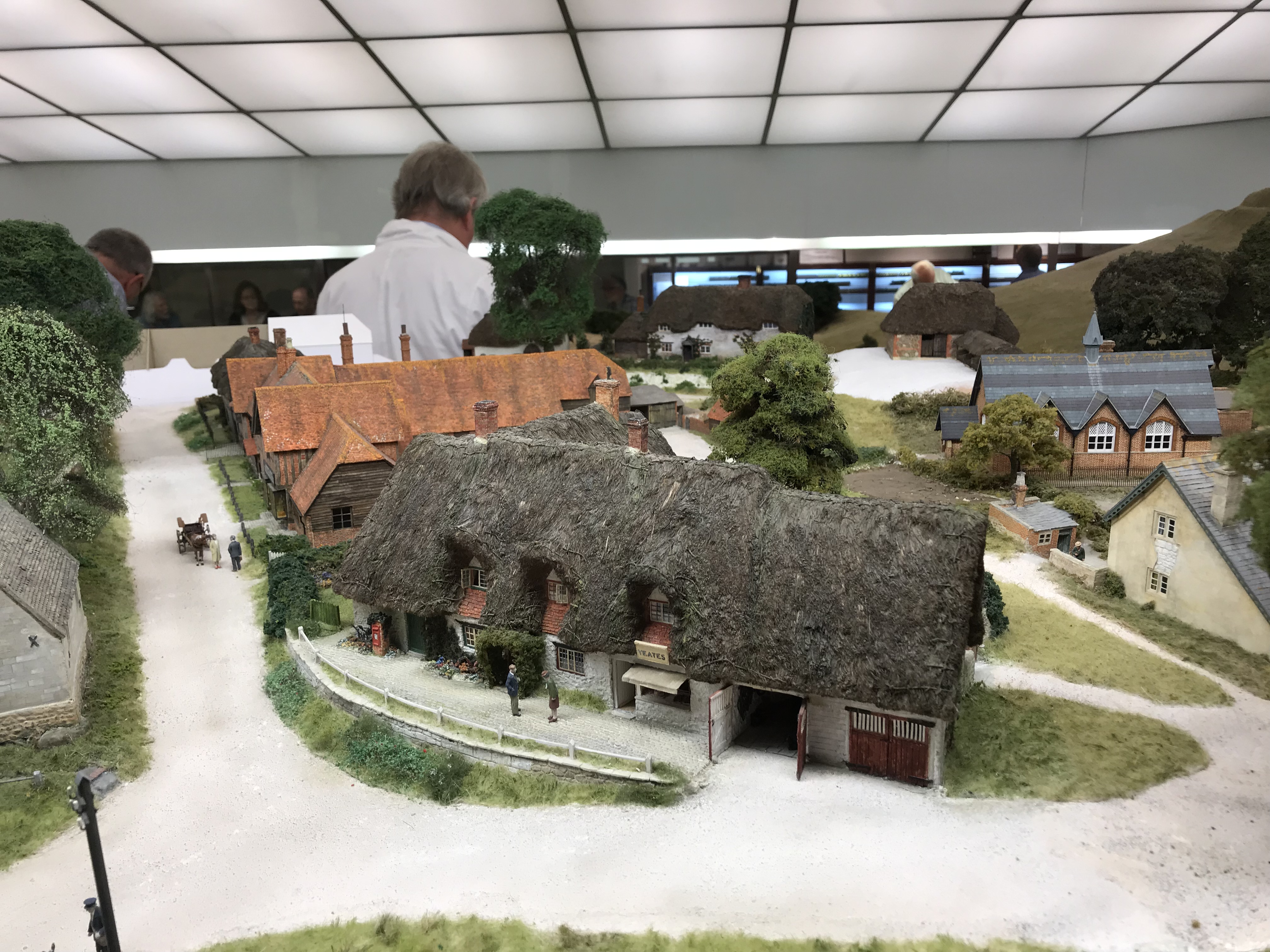 Quaint scenes of rural 1930s England in the White Horse Veil showcasing cottages and pubs modelled inside and out. Previously in small display cases, the scenes have been transplanted into a gymnasium-sized setting.