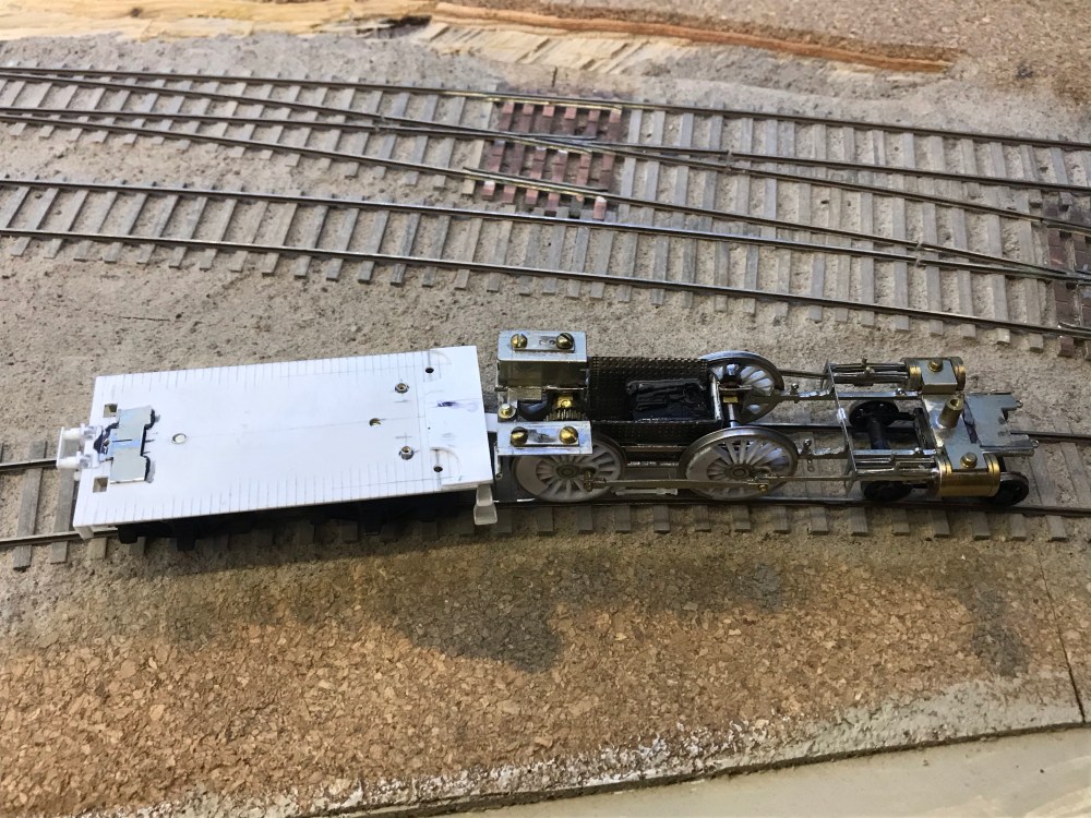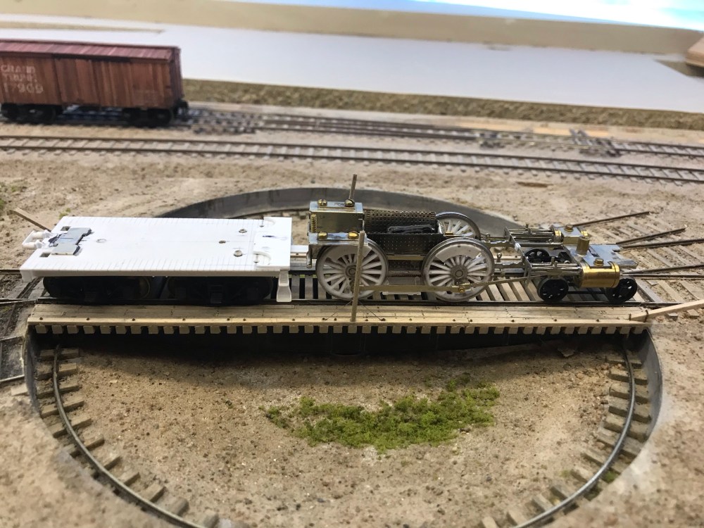 That curve is 36″ in radius and you’ll find it at the entry to the roundhouse. So I whipped up a couple of test couplings to see how short they could be. I can’t come close to the real coupling length, but my model needn’t look like a toy! While I was at the south end of town, I also tested the couplings to ensure the engine will fit on the turntable, because, well that would be a bit distressing if it didn’t!