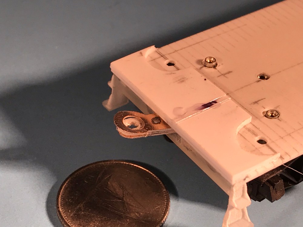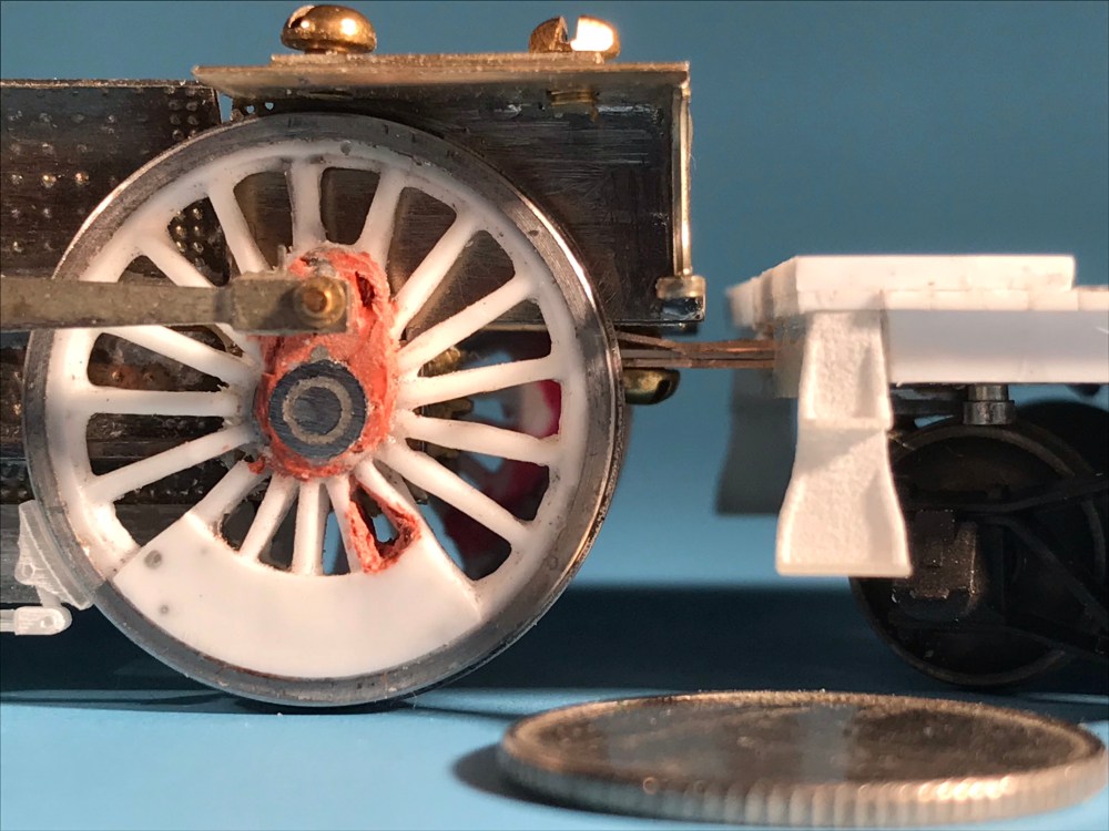 622’s tender coupling is a sandwich of phosphor bronze and styrene. The two layers of bronze carry track power from the two sides of the engine to the two sides of the tender through a mind-bending arrangement of layers and folds. Seriously, it is such a puzzle that I wasn’t certain I would have the left side of the tender hooked up to the left side of the locomotive until I tested it with a meter. Phew!
