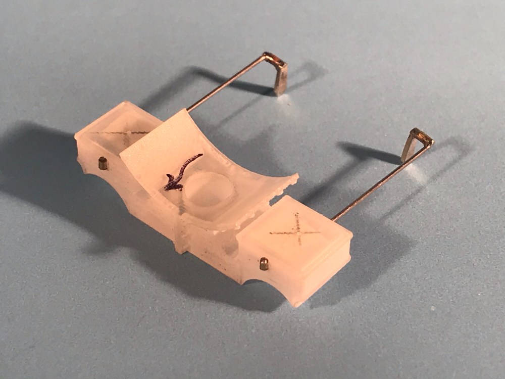 The valve rods are .020″ music wire, and pass through into 2×1 mm brass tubes that represent the valve rocker arms to the lever. The other end of the lever would be connected to the valve gear, but it breaks to enable removal of the cylinders. I modelled the valve glands with tiny slips of styrene.