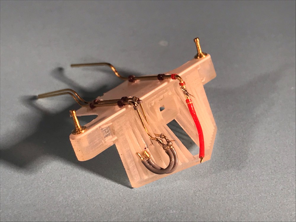 Except for more accurately modelling the connections, it probably doesn’t matter what the hoses were for. I modelled them with some wire and insulation. Two different sizes of wire required two different colours of insulation (though for the same nominal wire gauge). Insulation also helps make the elbow connectors and some of the other pipe fittings. Stop cocks are modelled with slivers of still finer wire.