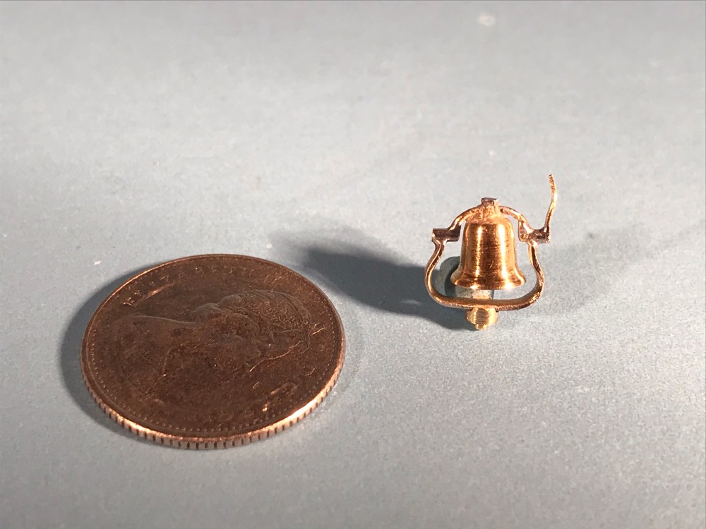 1. Pretty simple, really, Rob. I formed the top and bottom of the hanger and soldered them to a rod to represent the pivots with high-temperature solder. Then I filed the middle out of the pivot rod. The stand and bell were turned on the lathe and filed to make reliefs for the top and bottom of the hanger, respectively. Then I soldered them to the hanger with regular solder, basically holding the assembly by hand. Finally, I shaped the arm out of a piece of strip, and soldered it to the rest while it was still connected. Again, all by hand. Seriously, it was more art than science.