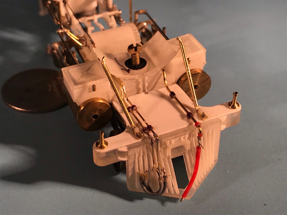 Despite their simplicity, these stays took a lot of fitting to get right, and I’m not convinced they will be robust enough to survive a lot of assembly and disassembly. If I had been clever, I would have made the foot of the stays into part of the pilot casting, and created a hole to push the actual stays into. Sadly, I was not that clever, and had to form the stays in place from two pieces of wire with their ends flattened. In an attempt to keep them from falling off in a slight breeze, I drilled the feet and glued a nut-bolt-washer casting through and into the end beam. Better than nothing: perhaps they will survive a slight breeze, but not a stiff one.