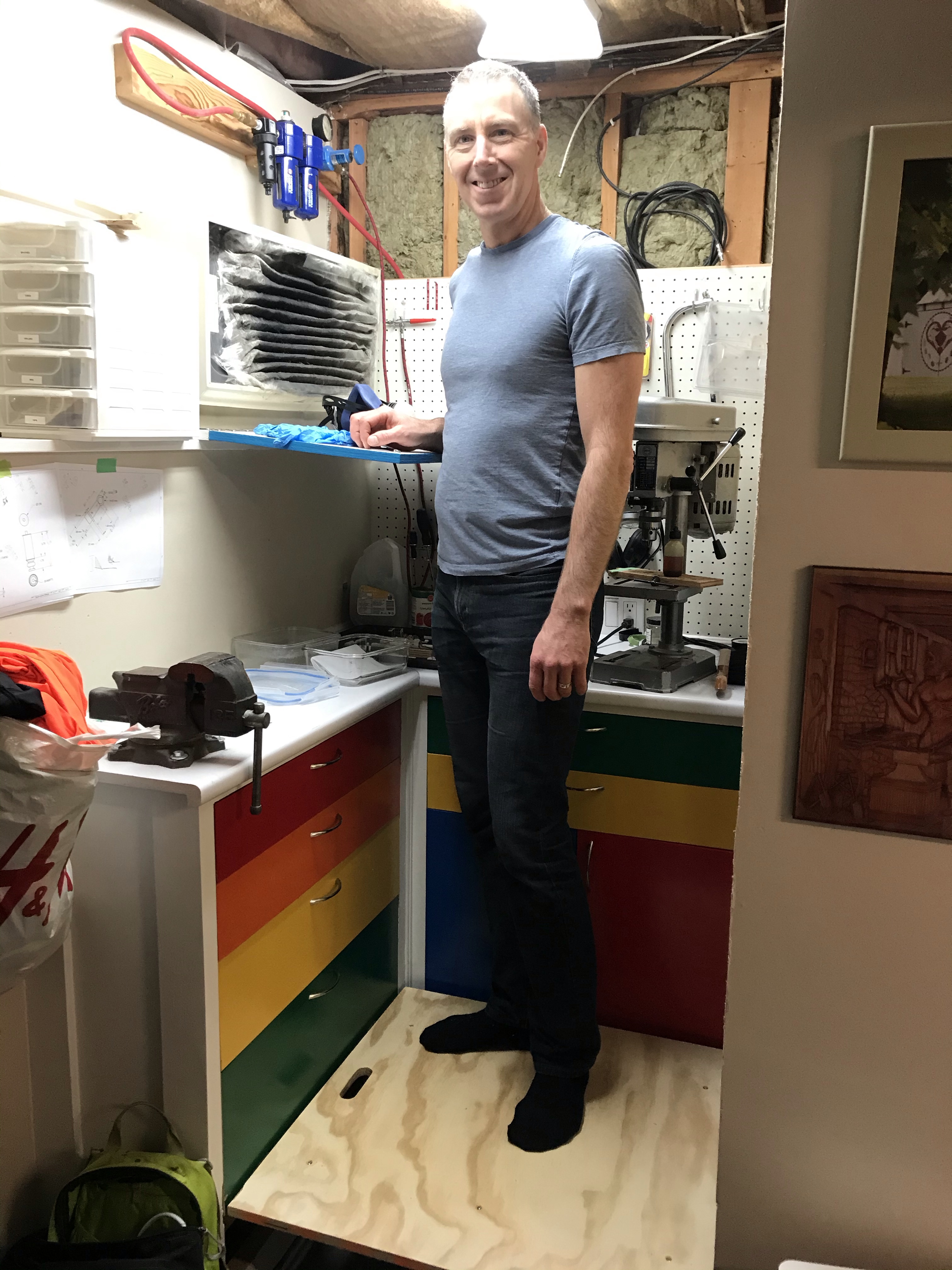 Now the heavy shop is only 44×52 inches (16 square feet / 1.5 m2 or only 0.9% of the total area of the house). So you may wonder how all those activities share such a small space. Naturally, the lathe and 3D printer tuck into a cupboard and a drawer respectively, freeing up counter space for each other. But the plan was always to build the paint shop above all that, and so I made the paint booth an awkward five feet off the floor.