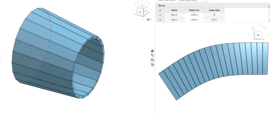 However, in the months since I made the original course, I’d come up with an idea to use OnShape’s Sheet Metal Model feature to lay out the material, rather than using trial and error. The proof of concept utilized two polygons of different sizes, but the same number of sides, and OnShape was able to produce a sheet metal model of the resulting faceted cone.