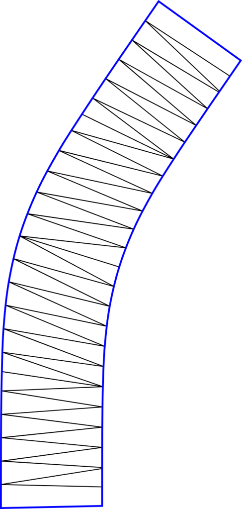 Once in Inkscape, I stitched the triangles together, and rotated them so they were aligned along their adjacent edges. The resulting 46 straight shapes make a very smooth curve, but I traced them with a spline to make the curve even smoother. I found that choosing every other vertex was sufficient. So perhaps, I could have been successful with only 20 sides, rather than 46.