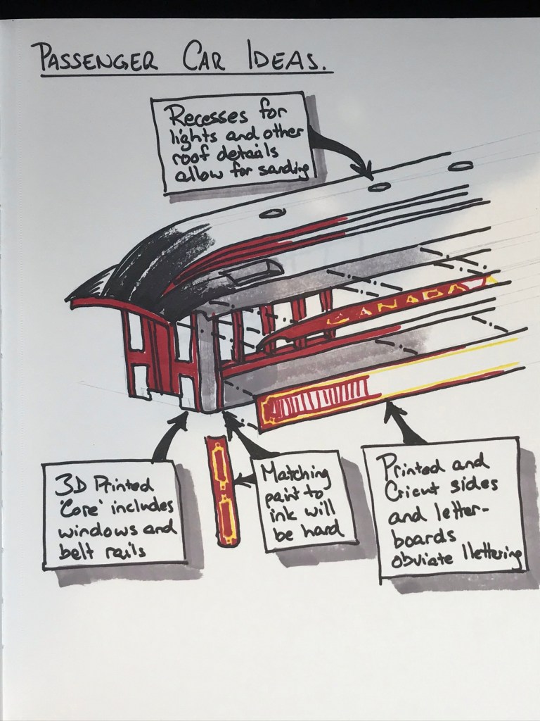 I lay awake the other night with a million projects rattling around my head until three in the morning, and one of them was the next passenger car. There is no near-term plan for another passenger car, and some of the thoughts, like printed and Cricut-embossed car sides, will likely be tested on freight cars before I get here. However, I thought I would capture the ideas before they either disappear, or overwhelm other ideas.