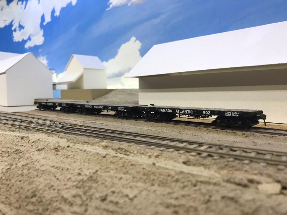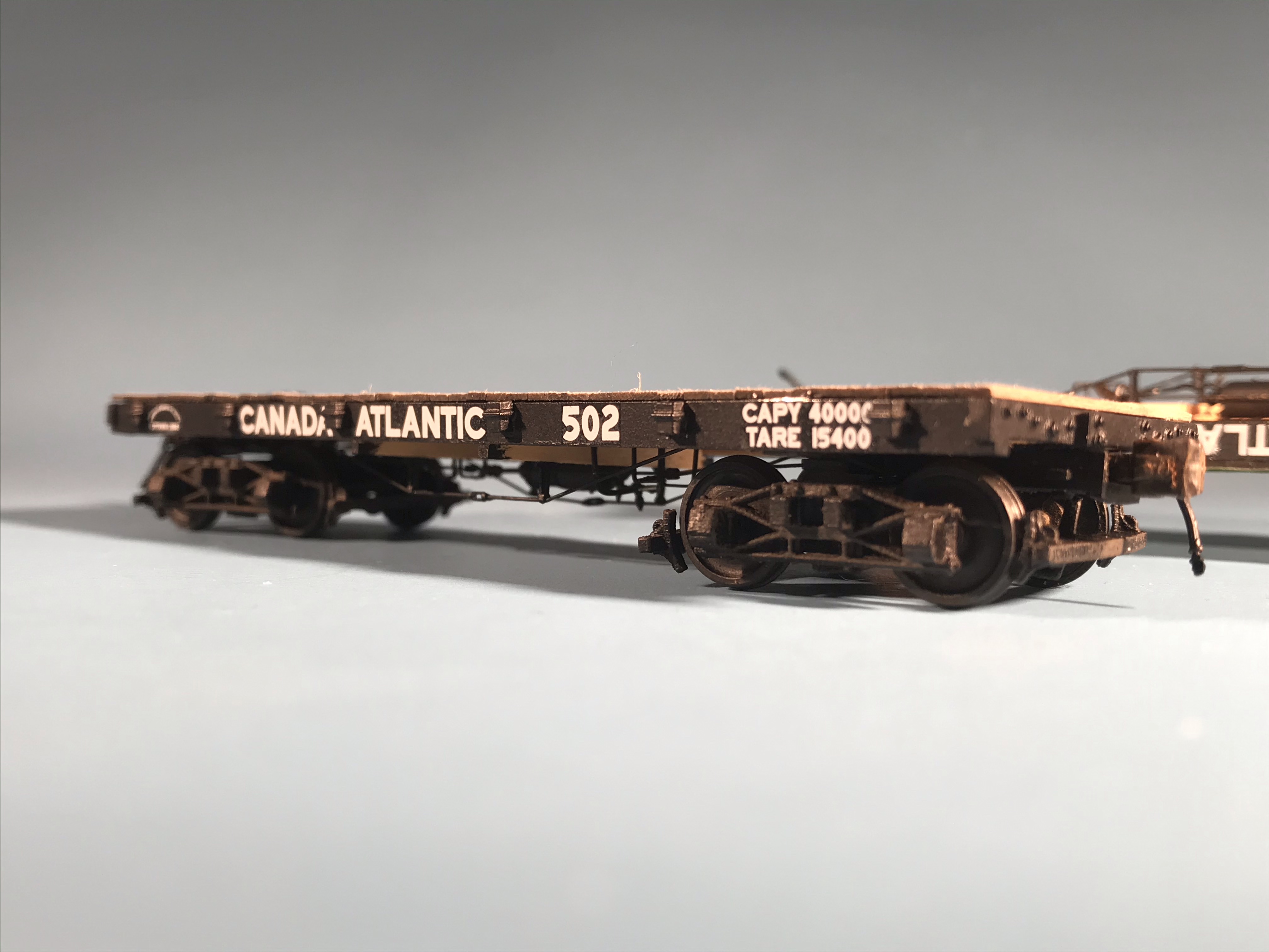 The Railway Modellers’ Meet starts with Iain Rice’s keynote this Saturday, and I’m going to have to declare the flatcars ready for display if I hope to get the locomotive into the display as well. It’s been a bit of a push even to get them this far. Every evening I think I’m going to be finished, and notice something else that needs to be done. Honestly, this is typical for me: I don’t think I’ve ever displayed a model when the paint was fully cured, and usually it needs to come back to the shop after display to get finished. However, deadlines help to make things happen, and if it weren’t for the Railway Modellers’ Meet, construction of these cars would probably continue to drag on for another four years.