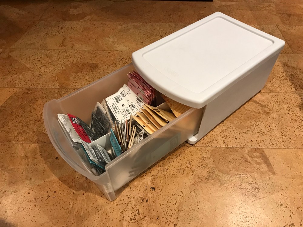 Up until now, I have squeezed all the packages into two ugly plastic drawers, which have lurked for years out of sight above the layout. Every time I’ve wanted to find something, it has meant flicking through every package, like shopping for records without the titillating cover art. To make matters worse, the drawers wouldn’t open all the way, and so, if I was really serious I would have to take the last twenty or so packets out to see what they contained.