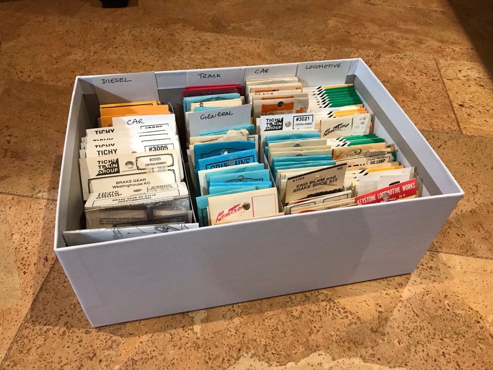 I cut some dividers from Bristol board, and then sorted all the packages into coarse categories. Within the categories, the packages are then sorted by type – all nut-bolt-wash castings arranged by size, for example. One of the boxes is for parts for buildings, and the other is for rolling stock. So next time when I’m looking for chain, I should be able to find it with minimal browsing.