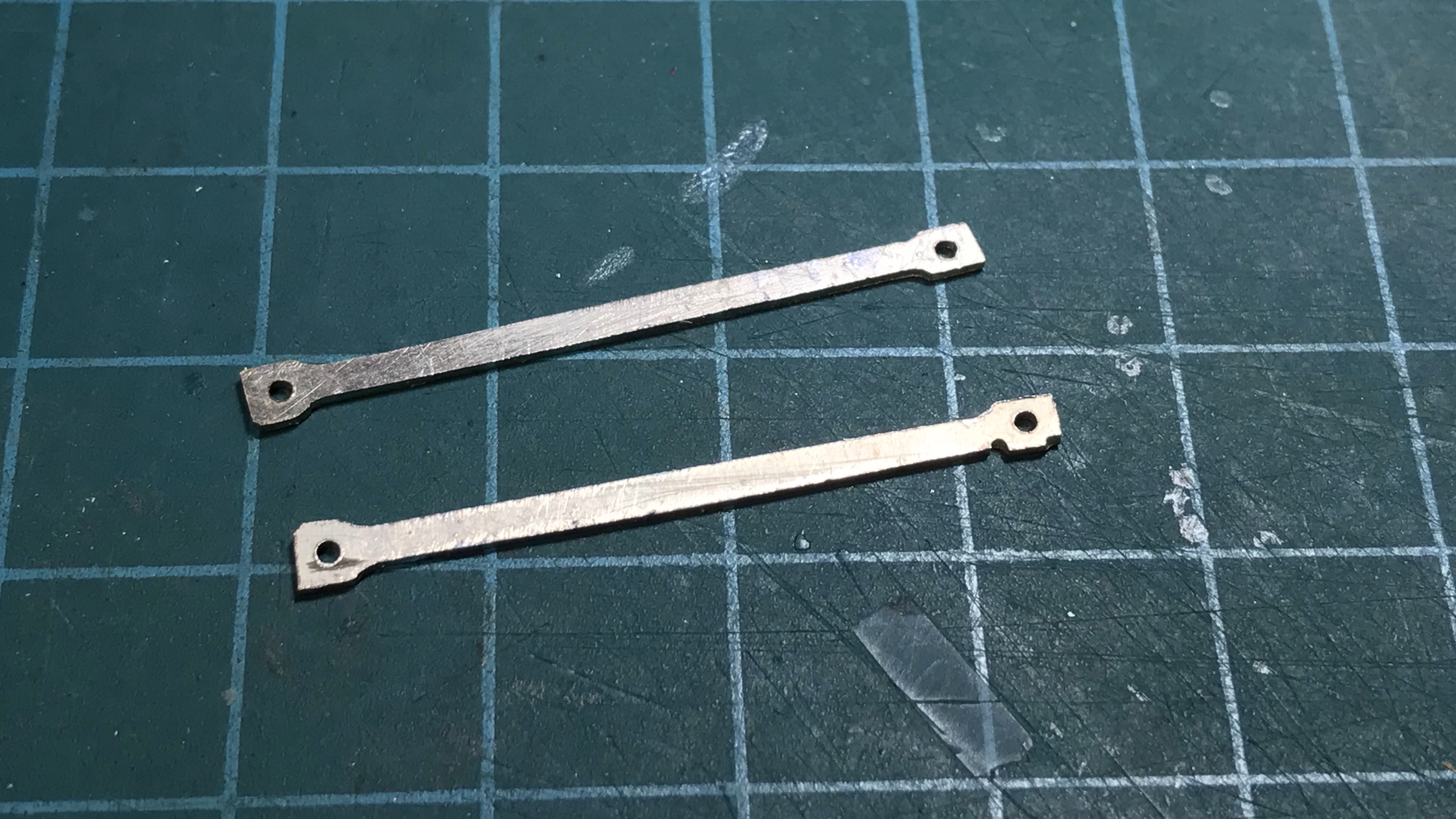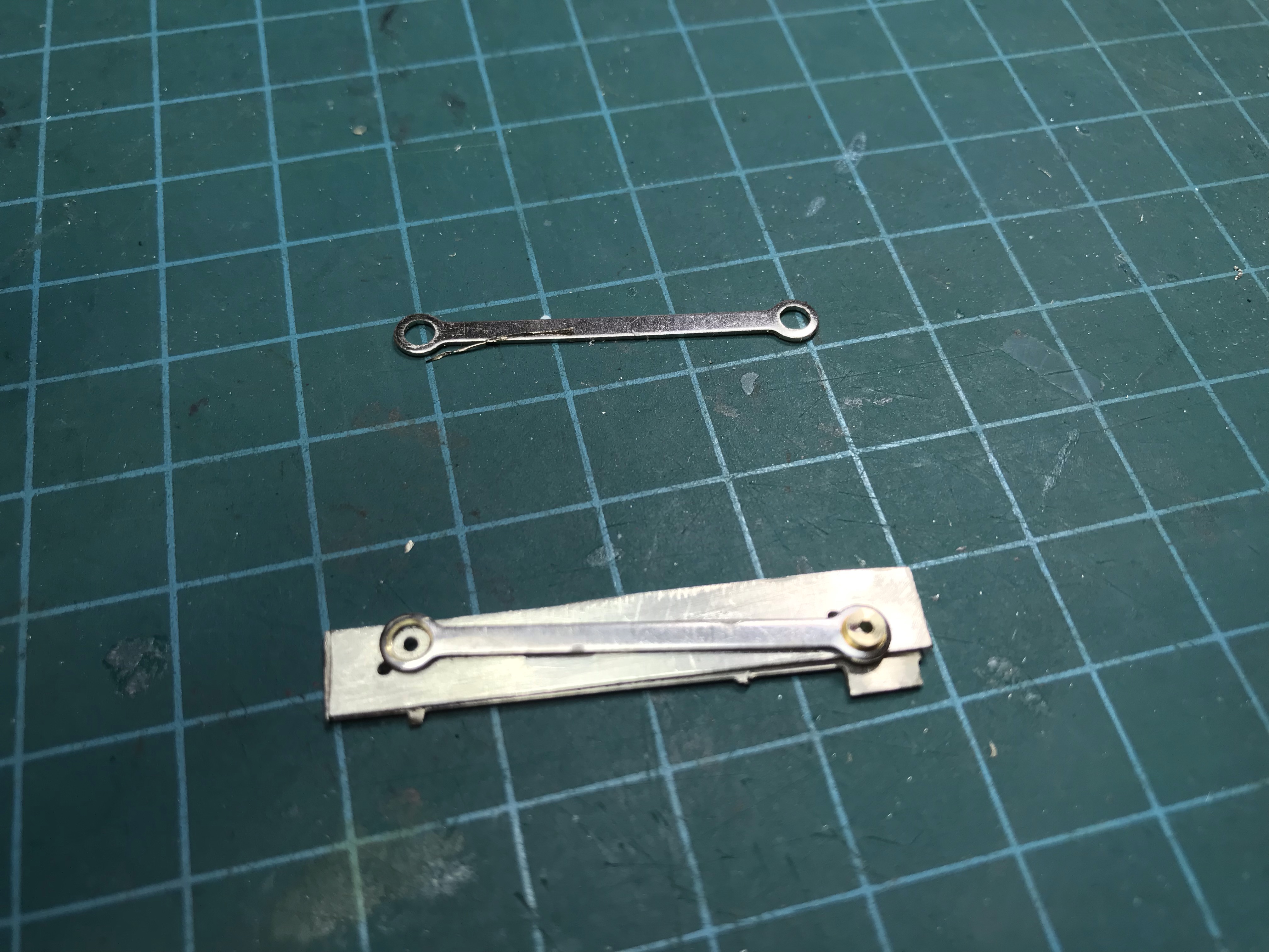 Unfortunately, this experiment required new connecting rods. I followed the time-honoured tradition of soldering two layers of nickel silver together. I then glued one of Percy’s rods to the sandwich with CA. A little custom-turned bushing helped to guide the drill bit into the centres of the two original holes, and then I used CA debonder to remove the original rod. I filed the blank (very) roughly to shape before separating the two rods, and cleaning up all the burs.