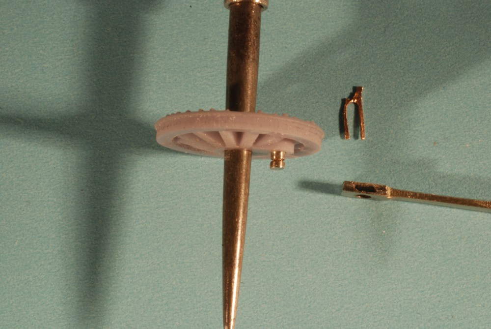 Main rod (front) crank pins in my era were up to about six inches in diameter, while connecting rod crank pins were about three to four inches. Because the connecting rods are on the outside, it makes sense to attempt to make the model reflect the smaller crank pins. The first attempt aimed for 1 mm crank pins; however, by the time a groove had been cut to hold onto the key, the crank pin was starting to get a little delicate, and it ultimately broke.