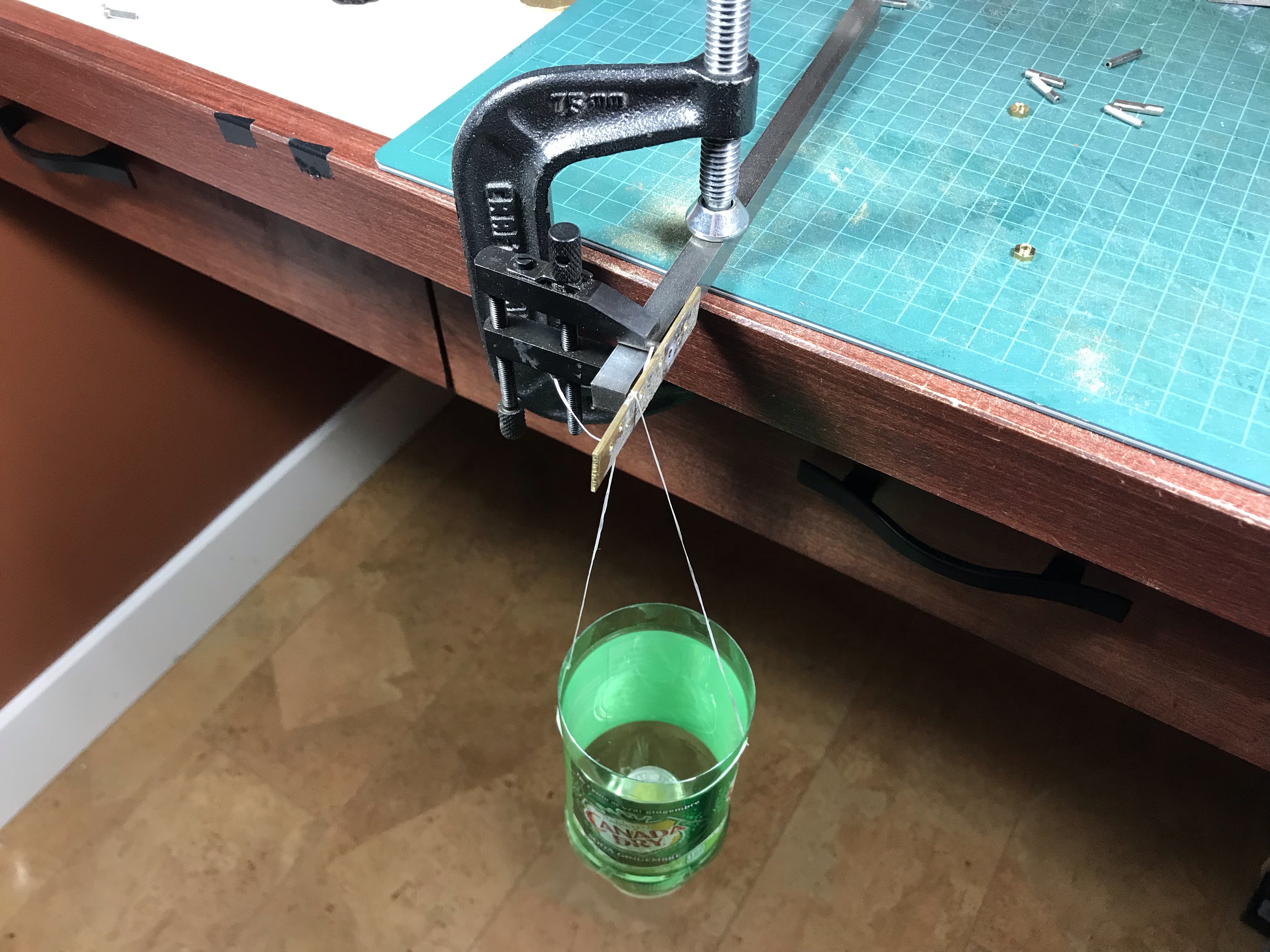 I devised an experimental setup involving clamps, a scrap of brass that pressed over a hex-shaped test piece representing the wheel centre, some incredibly strong dental floss, and a ginger ale bottle full of coins. My son, who knows exactly what high school science experiments require blanched in horror when he saw this apparatus. However, remembering that they laughed at Newton, I pressed on and tested four methods of holding onto a slippery stainless steel axle: