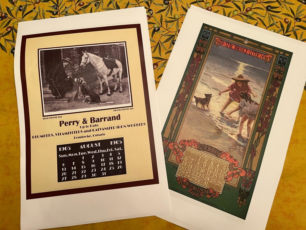 Further searching turned up a collection of beautiful Art Nouveau lithograph calendars at the University of Cincinnati. It seems unlikely that one of these would have found its way as far as the depot office in Pembroke, but they are exactly the look I’m after.