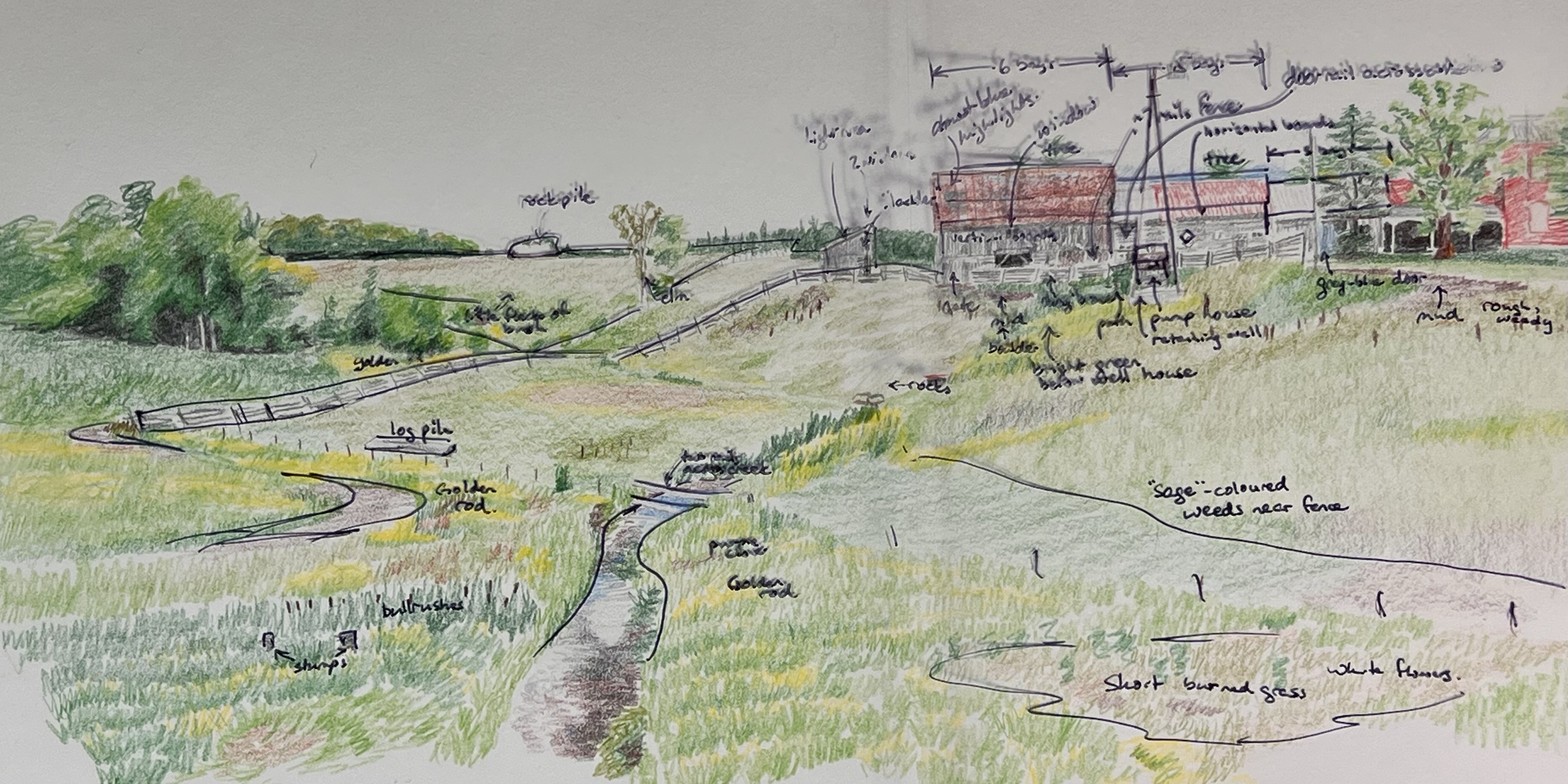 I taped an unfolded plastic page protector over the drawing so I could note things as I found them in the drawing. Even in this simple scene, I found details I hadn’t noticed when viewing the photograph – from cattle-churned mud in front of the gate to stumps among the bulrushes in the foreground.