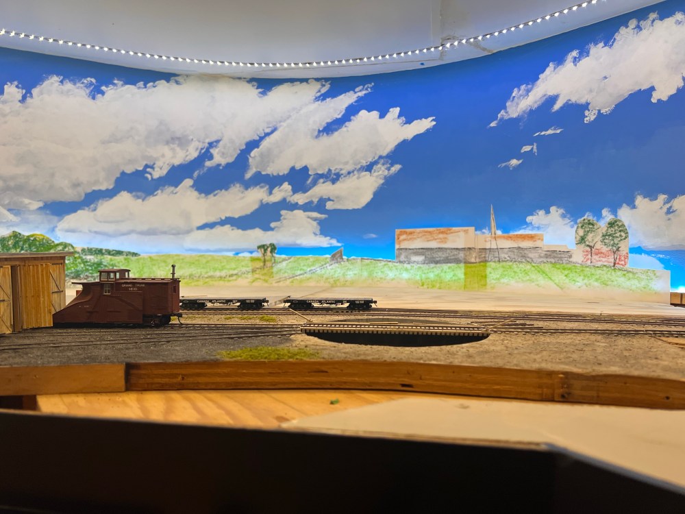 Overall, I’m pleased with the way the scene plays on the layout. The two fences make leading lines that mimic those in the clouds, and pull the eye down and to the left, toward the cattle pen behind the roundhouse.