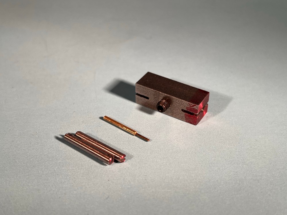 I made a little go-no-go gauge out of a couple of pieces of wire and a tube. The “go” wire slipped through my fingers and joined the myriad other items holed up interdimensionally in the vicinity of the floor. Fortunately, apart from taking this photo, I had finished with it by the time it winked out of our existence.