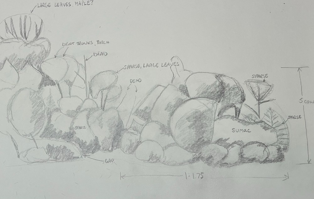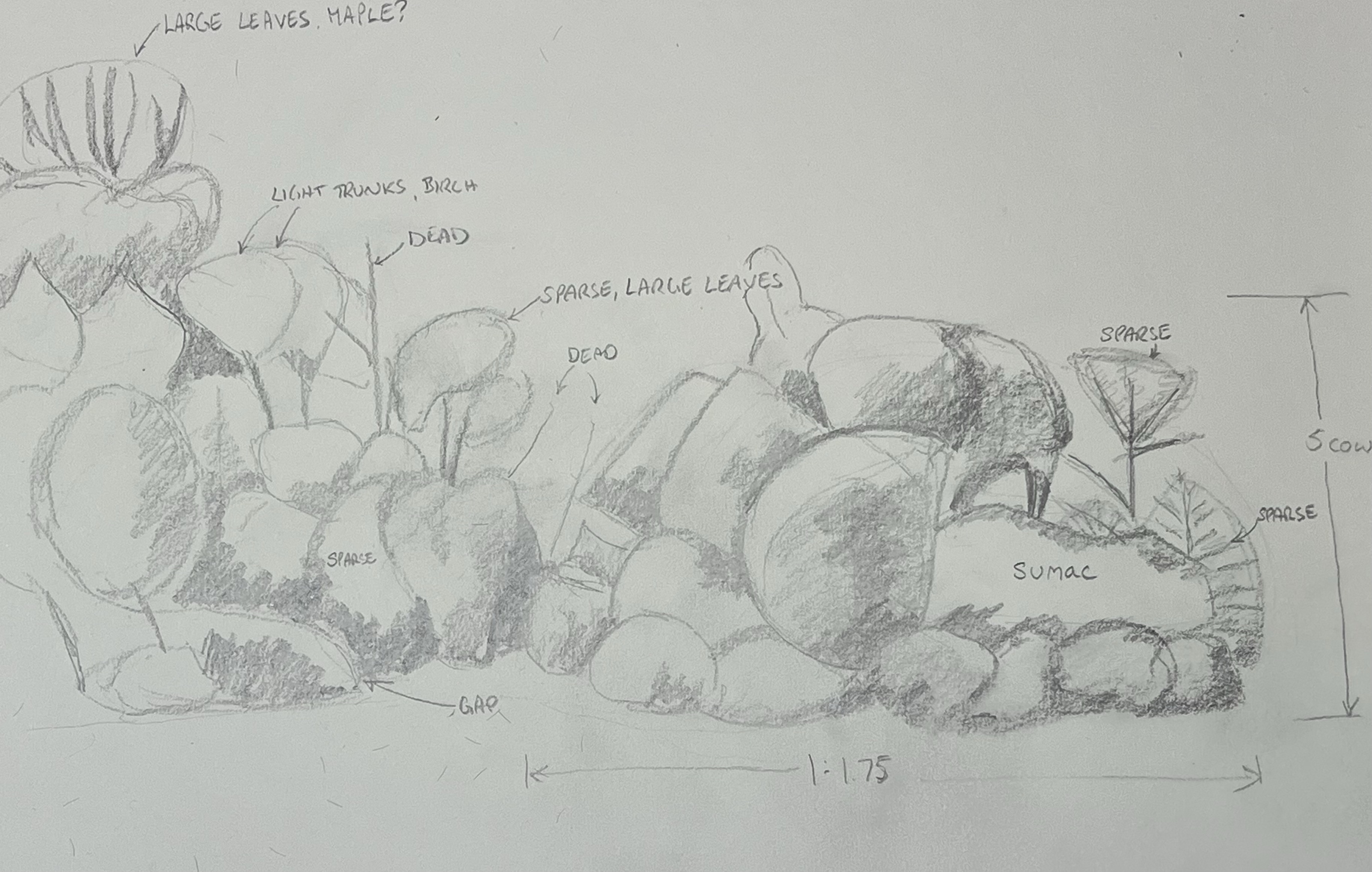 I concentrated a drawing on the copse, trying to identify individual trees, and where I could, identifying a possible species. The resulting sketch looks like a pile of boulders, but I hope it will inform the modelling.