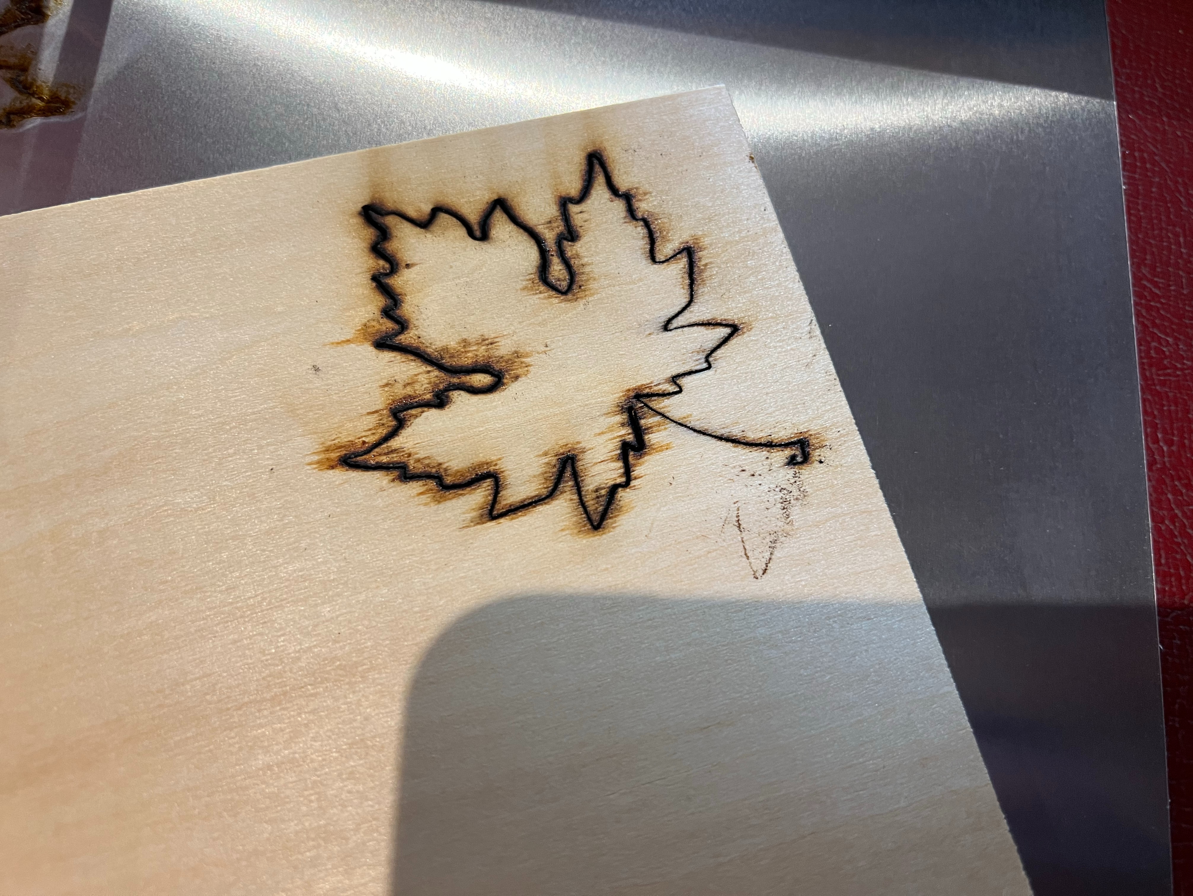 The tool came with a little sample pack of materials, and the software includes some sample shapes. So, being Canadian, I chose the sample maple leaf and the sample 3mm basswood plywood and turned the whole contraption on.