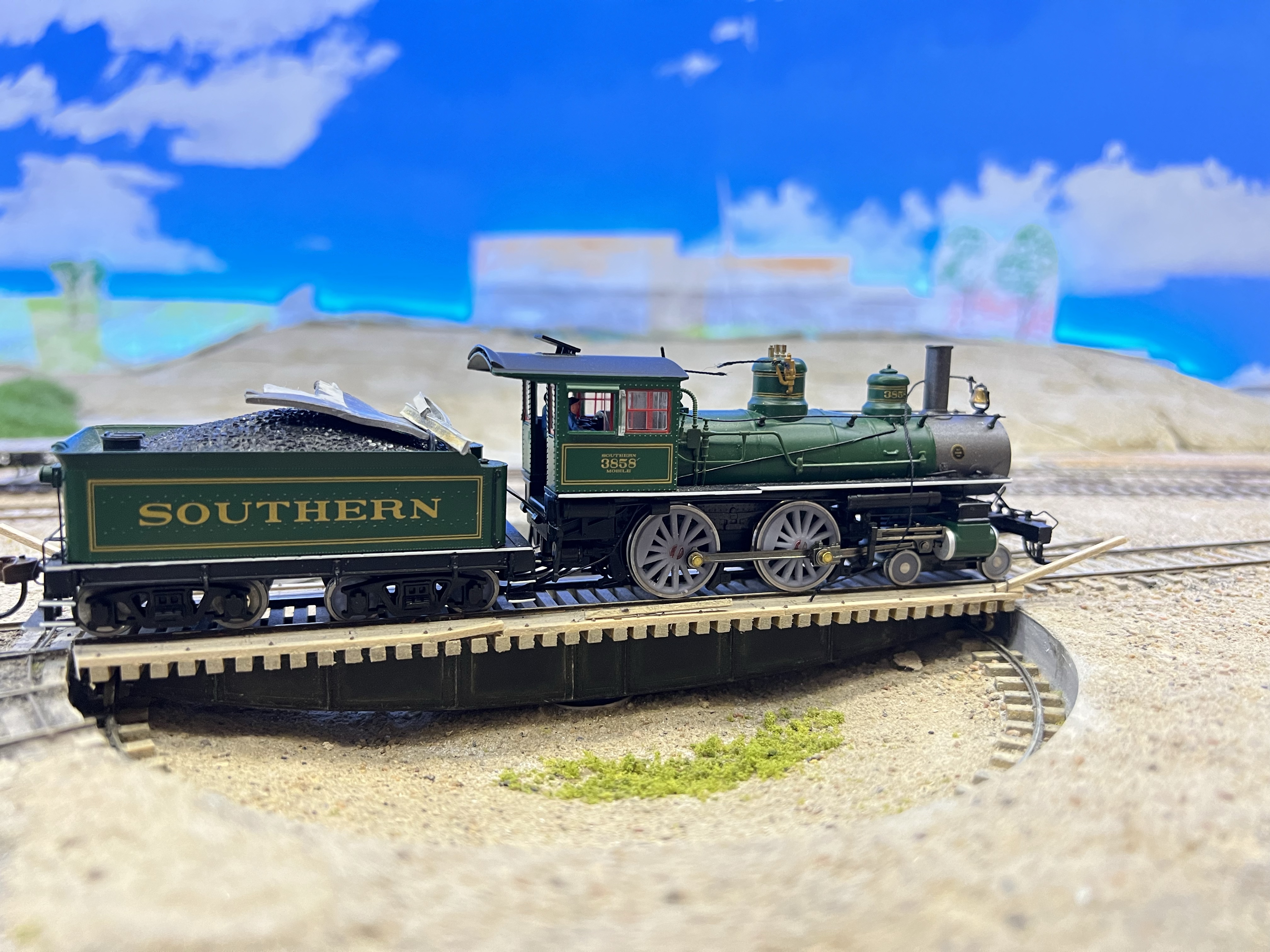 GTR 1120 replaced 2543 on this morning’s mixed train (45) and returned on the noon passenger (44). Still in her original Southern Railroad livery, the test run revealed some improvements are in order to both track and engine.