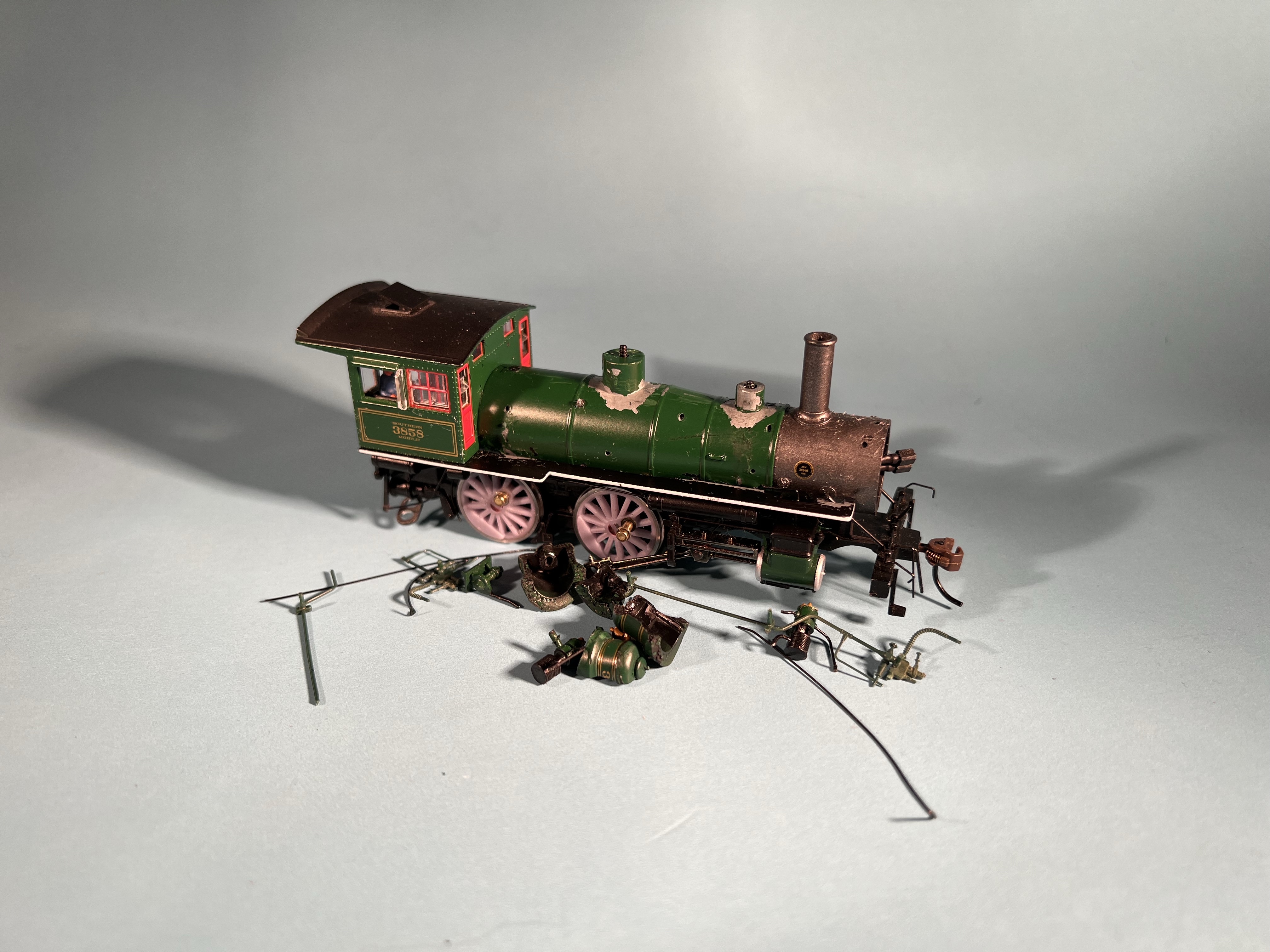 The first step in back-dating the Spectrum Modern 4-4-0 to an 1890 Brooks product is getting rid of all the bits that don’t look Brooks-y. There are numerous modern details and appliances that are not appropriate for my 1905 timeframe. In fact, all the boiler fittings came off, with the exception of the stack and the builder plates. Brooks had circular builders’ plates, and so I left the illegible Baldwin plates in place.