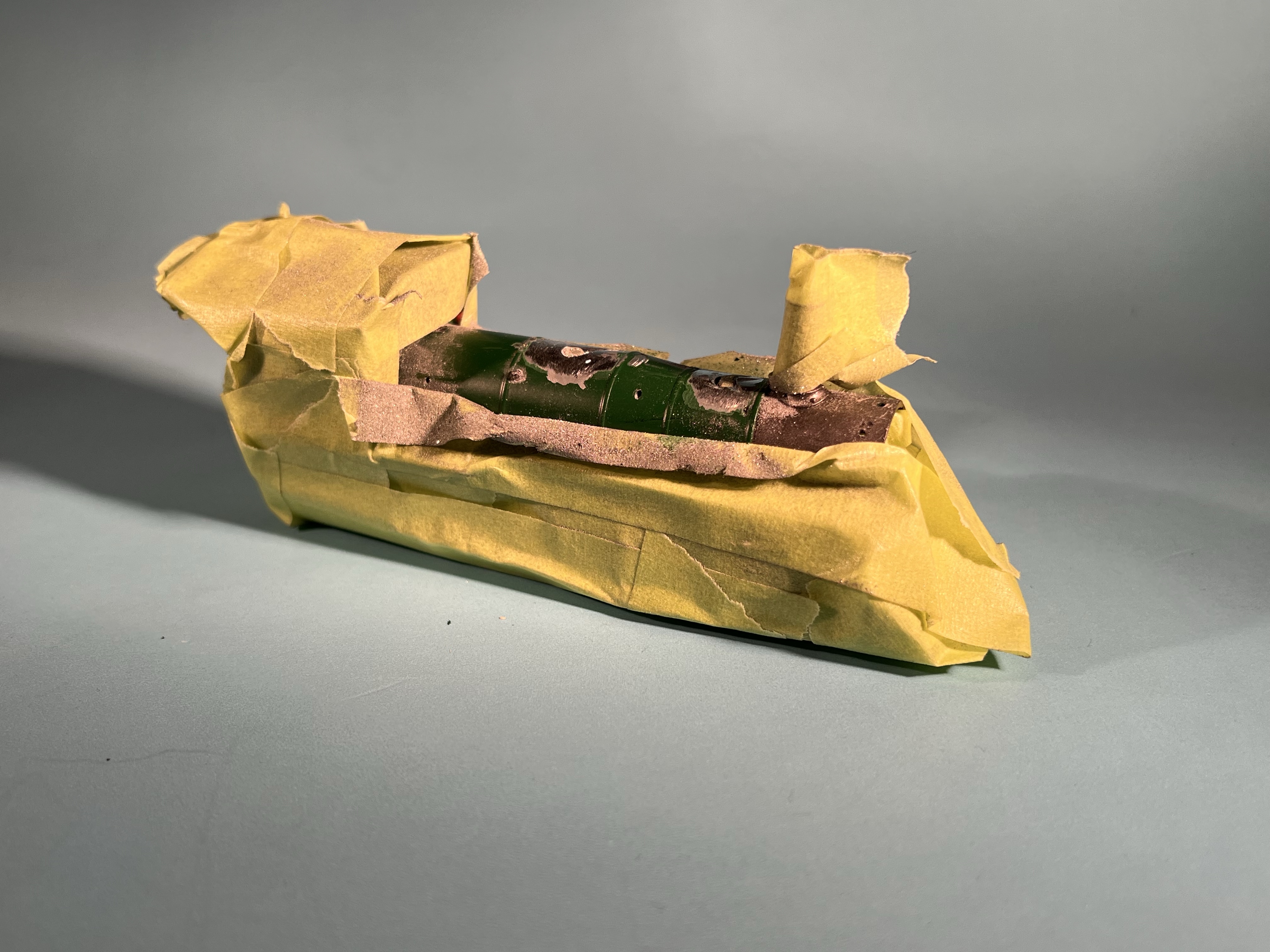 I wrapped the loco in masking tape in an effort to keep metal filings out of places it shouldn’t be, and also to try to keep from slipping disastrously too. I still have plenty of filling and sanding to do, but it could have been worse.