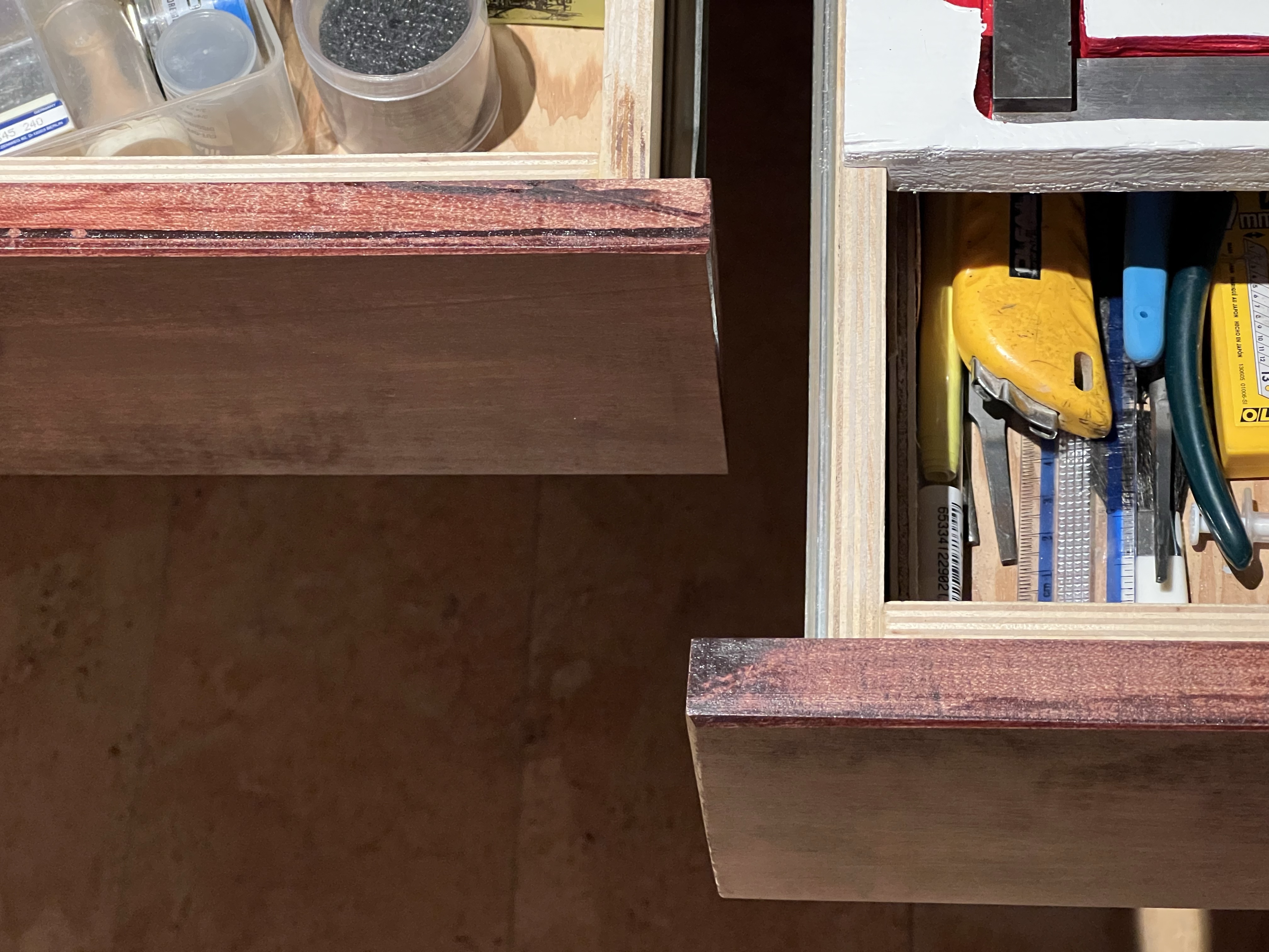 I saved some money when I built my modelling desk by using some drawer slides I’d found at ReStore. While they were the right length, they were partial extension or regular or whatever the opposite of “full extension” is. With the two-inch overhang of the desktop to facilitate clamping, these slides wound up hiding the last six or seven inches of the drawers.