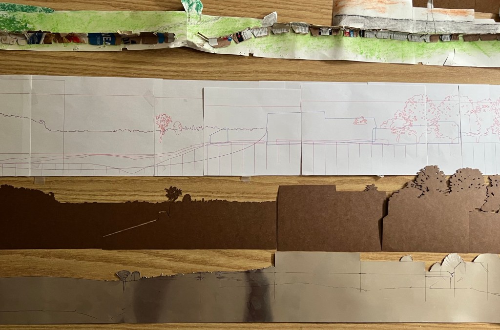 With the drawing matching the ground as modelled, I broke it into pieces so it would fit on the laser. The pieces follow the natural edges in the final scene, so hopefully they will not be noticeable.
