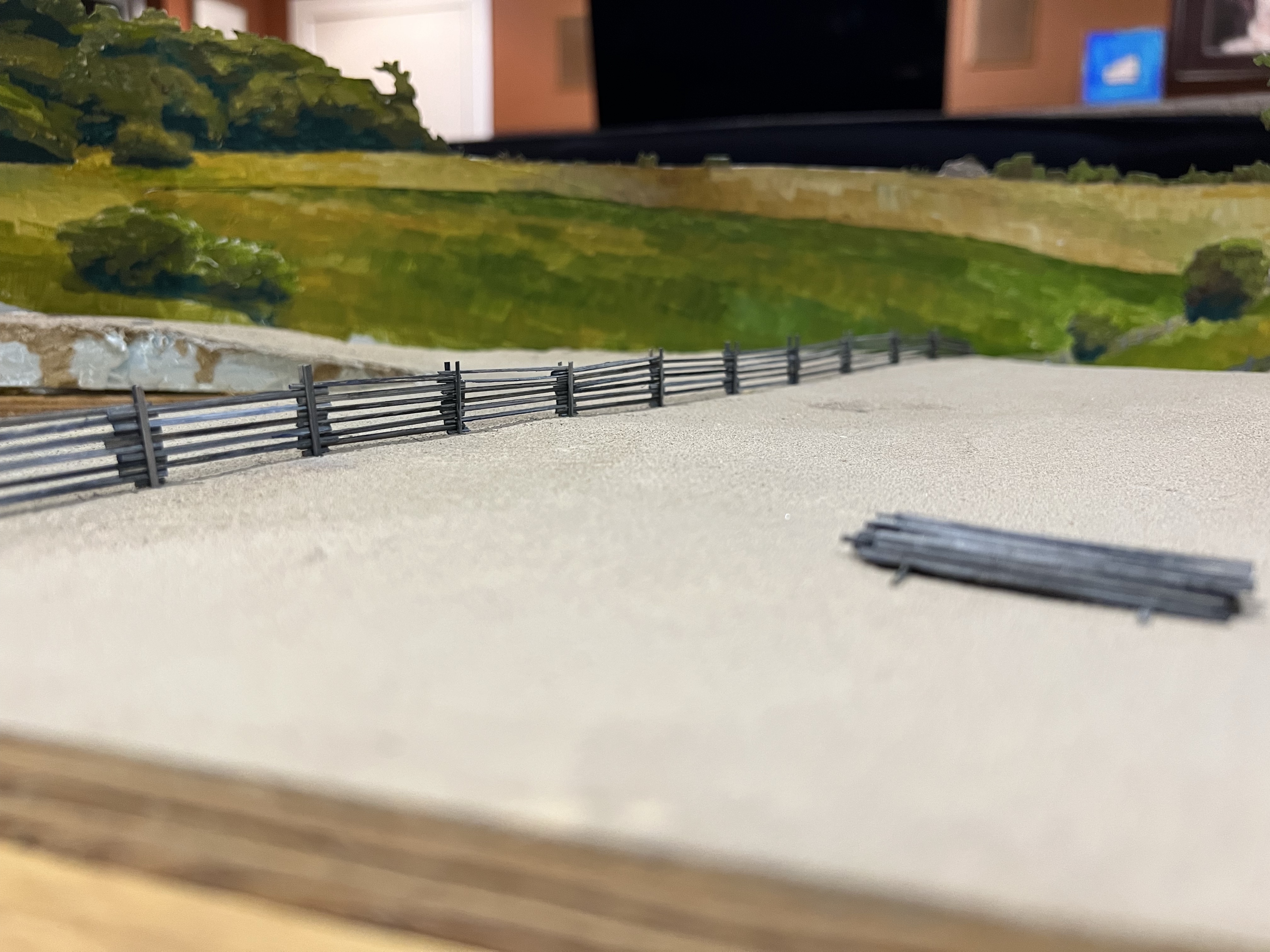 To accomplish this forced perspective, I went through all the rails yet again and sorted them into three piles by size. The largest ones went into the nearest two or three panels, and the smallest ones were furthest. This helped to reduce the size of the fence with distance, while keeping the same number of rails over the length of the fence.