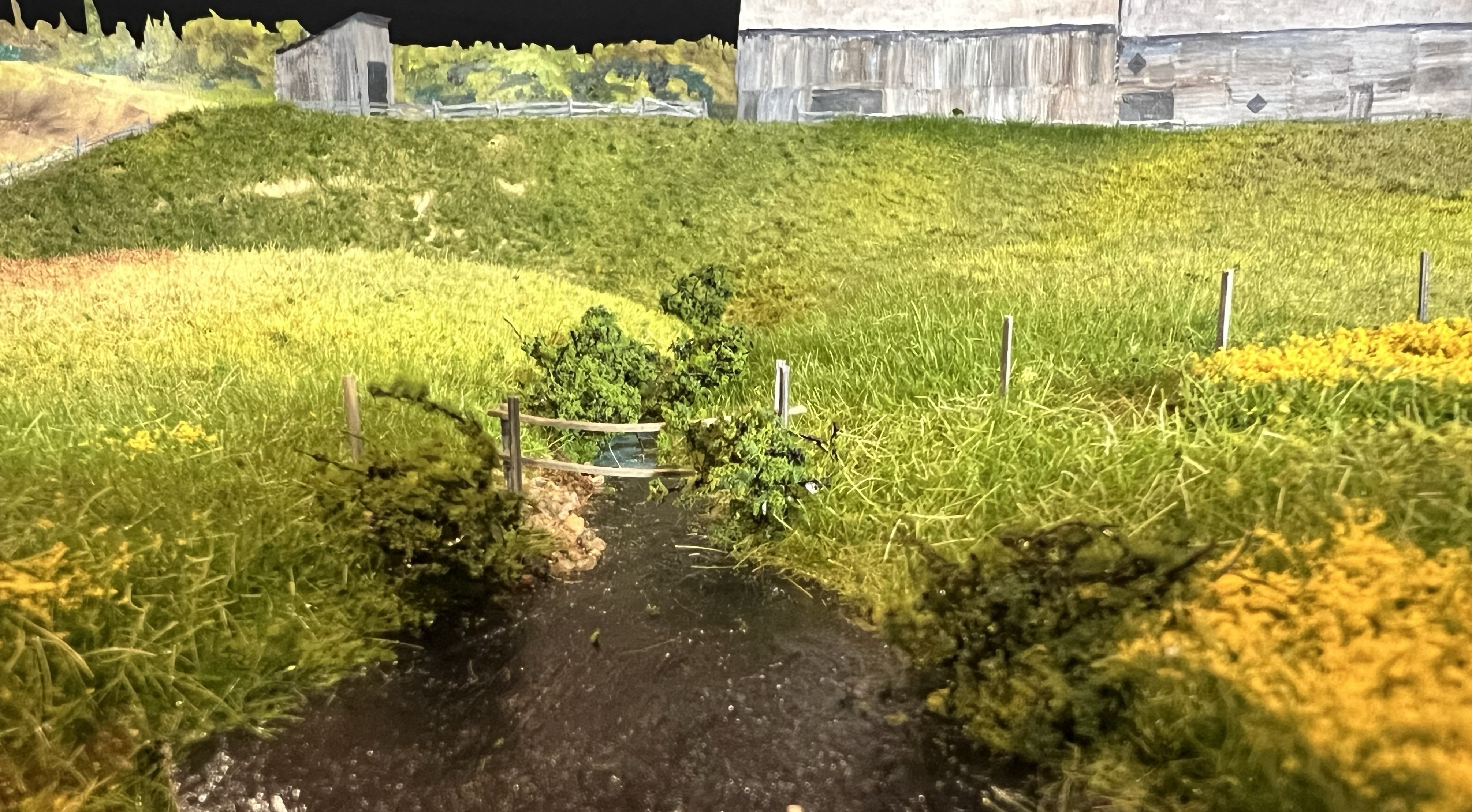 Most of the pasture consists of grass and weeds, but the stream is lined with bushes to such an extent that it often disappears. A couple of years ago, after reading Gordon Gravett’s books, I ordered a small square of rubberized horsehair from Treemendus. When it arrived, along with a small shank of postiche, I remember thinking I would have to place a second order before the layout was finished. Now I’m not so sure as both products yield a lot of scenery for the size of the original material.