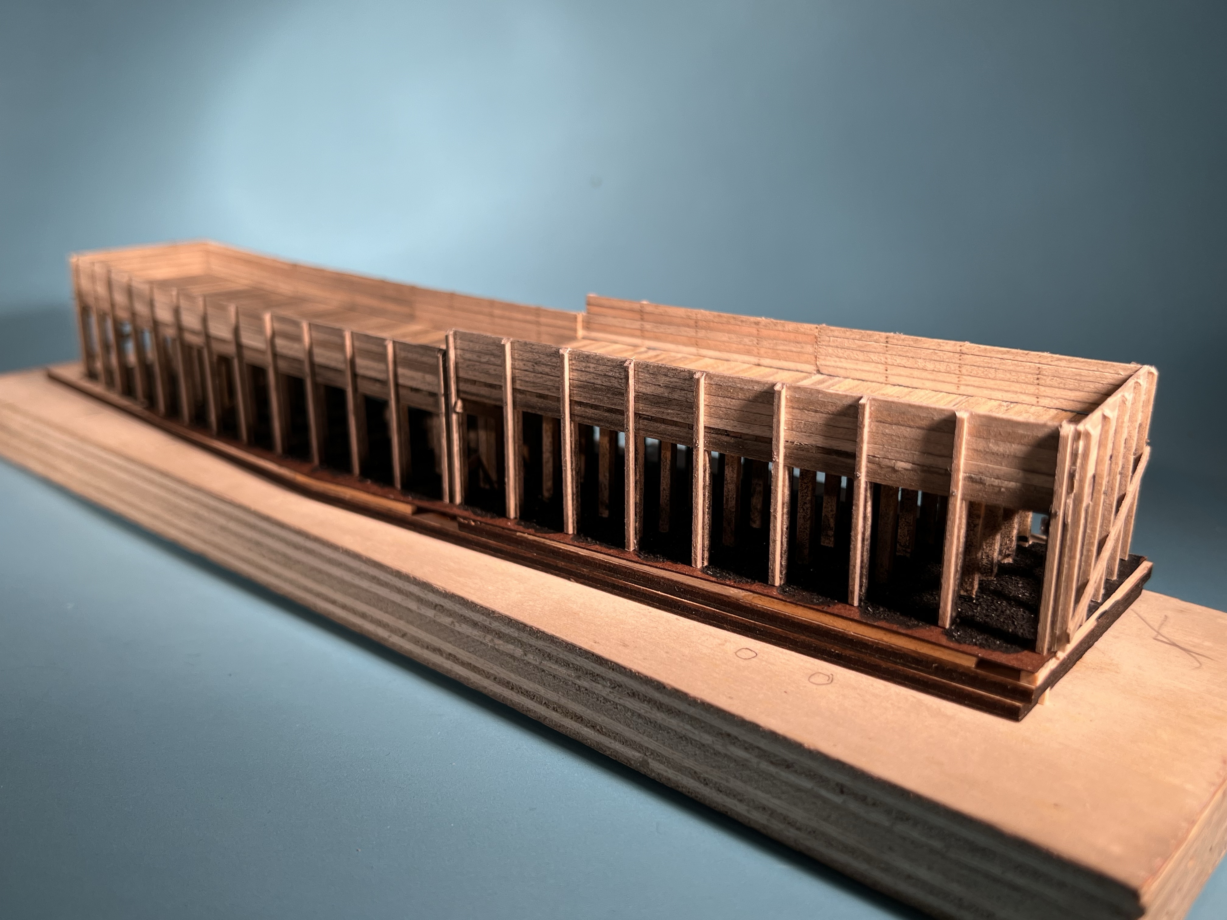 The sides were a straightforward bit of modelling, with the caveat again that no two sticks of wood were exactly the same length, owing to the grade and curve of the service track. Each of the supporting posts extends almost, but not entirely to the ground, which rises beneath the structure. Meanwhile, each section of wall was about 16 feet, but no two sections were identical because the curve is a spiral easement; one end is nearly straight.