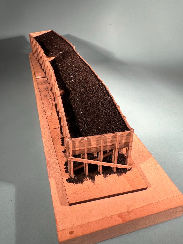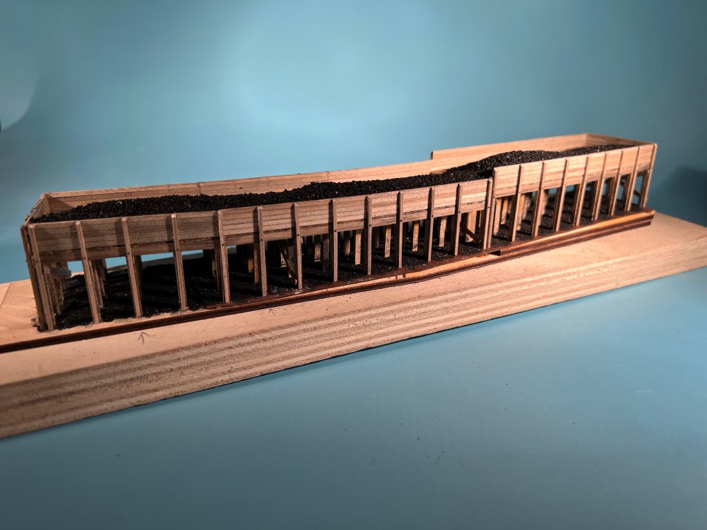 Posted on November 27, 2023 by renegourley The coal piles managed to find their way onto the dock, and on the right side of the dock, too. I’m declaring this model done and ready for installation on the layout. Unlike most of my models, I finished this one before it finished me! Trackside view. Farside view End view Share this: Click to share on X (Opens in new window) X Click to share on Facebook (Opens in new window) Facebook Like Loading... Related