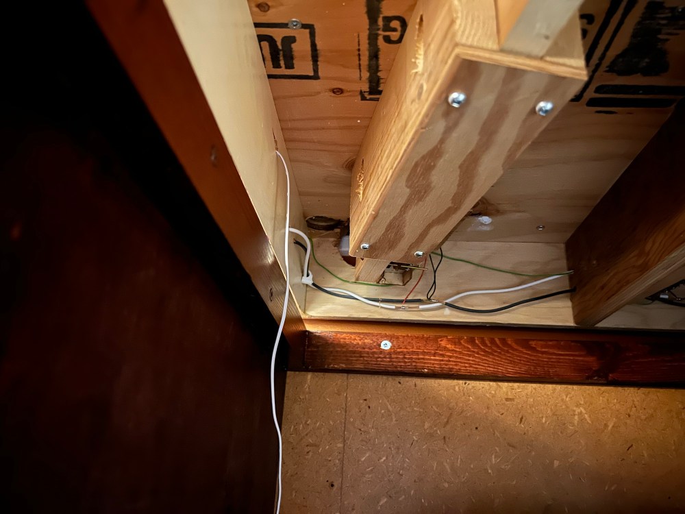 I had thought, or maybe hoped, that that the water tower was going to line up to the left (north) of the joist. However, there is some rule about joists, that places them exactly where they are least convenient, and when rulers and pencils got involved, it emerged that the best place for the water tower is directly on the joist. Second best is to the right of the joist. However, when we peak under the layout there, we find that space is filled with hefty slides that drive the first two turnouts on the layout.