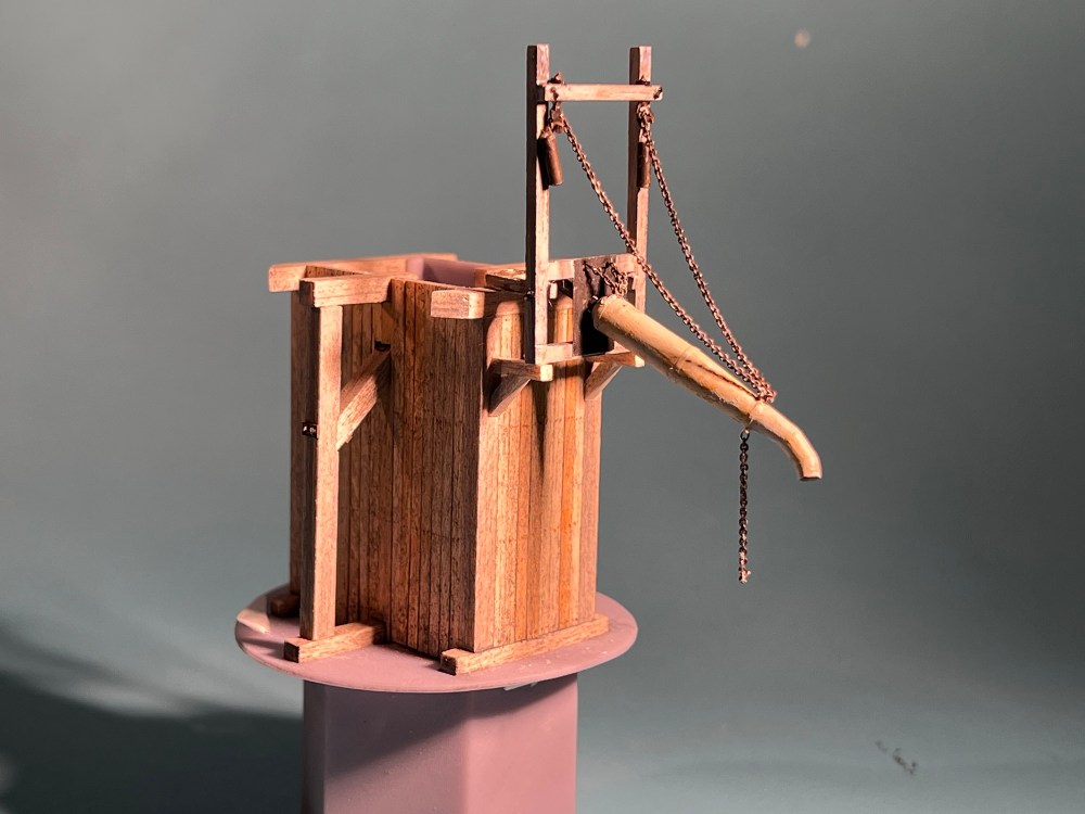 It took two attempts – the first with epoxy, and the second with CA – to get the spout and frame mounted on the base. The epoxy didn’t work out because even with help from my darling wife, I wasn’t able to clamp it where I wanted it. With CA, I could hold it by hand until it was solid. Then I drilled through the holes and into the timber beyond to pin it in place. The resulting structure feels solid enough.