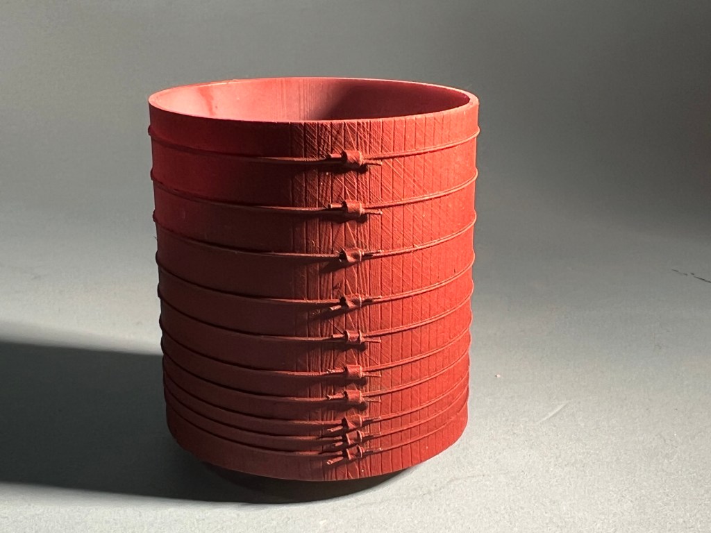 Now we get to the meat of the matter: the tank is usually considered the hardest part about building a water tower. In my case, the hard work was mostly done in OnShape. The prototype tank in Wakefield has two different types of band connectors, and they are in different orientations. I copied these differences slavishly in my version, and as a result I had to draw each band individually. There are 160 features (think commands) in the tank drawing, compared with 11 in the base and eight in the roof.