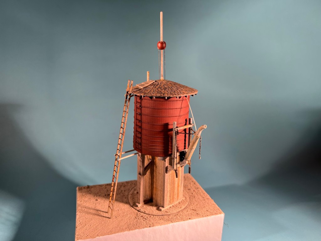 I think we’ll call the water tower complete for now. I wound up printing the ladder so I could get round rungs without losing my mind drilling holes. The wooden supports for the ladder are quite delicate, and the ladder just lies in there loose so I can remove the roof and mess with the mechanism. If I were building another water tower, I would put more thought into how the roof gets held in place while staying removable.