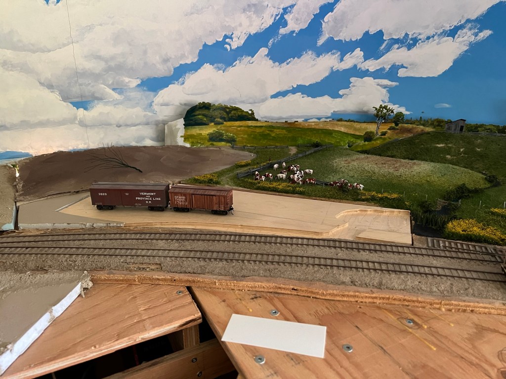 I don’t recall why a former me decided to leave the stock spur as a short stub. I’m sure it seemed reasonable at the time. Maybe I planned to build a stock pen together with the spur. In any event that part of the layout has been a piece of 12 mm foam core for years.