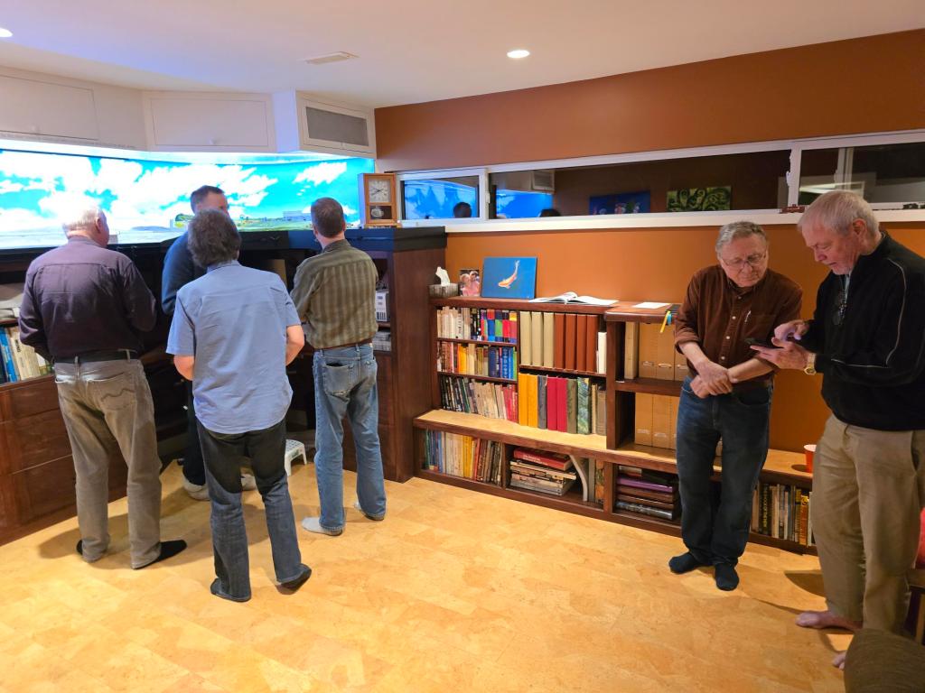 With the railroad was in decent shape – no rails missing and at least one engine in steam and the cobwebs collected from over the pasture – I invited our neighbours to check on progress today. The energy level with six or eight kids under 11, their parents, and half-a-dozen empty-nesters in the room was Formula 1 to the North Shore Model Railroaders’ PGA. At one time there were three boys on one step stool hanging onto the edge of the Muskrat River as a sister standing on an office chair drove the train under their noses.