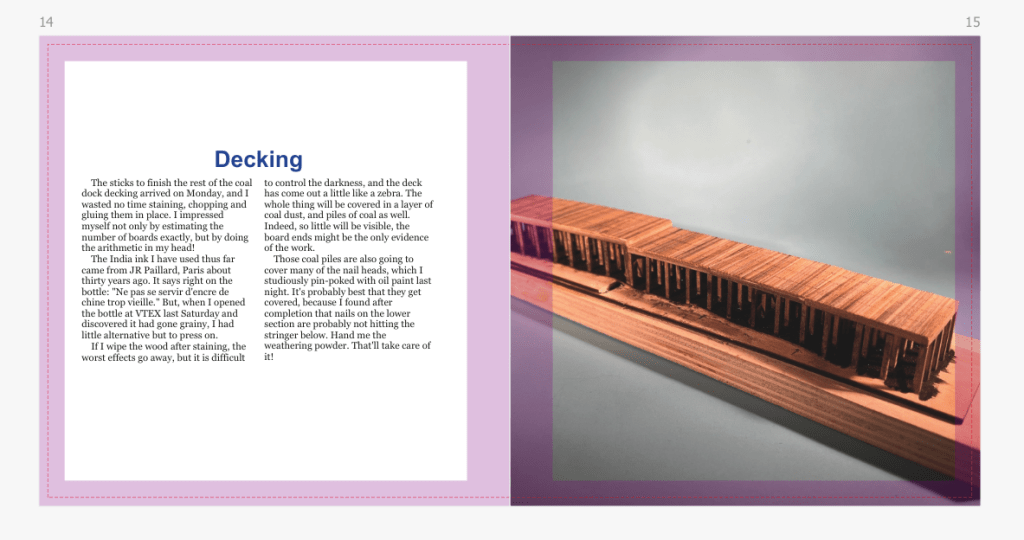 I took an hour or so to throw together a proof of concept, based on the coal dock. Each two-page spread consists of a blog post on the left and the relevant photos on the right. Most of my modelling blog posts are quite short, so they fit on the page without a problem. Usually there are only one or two photos, and I made them bleed to the edges because I like books with full page photos.