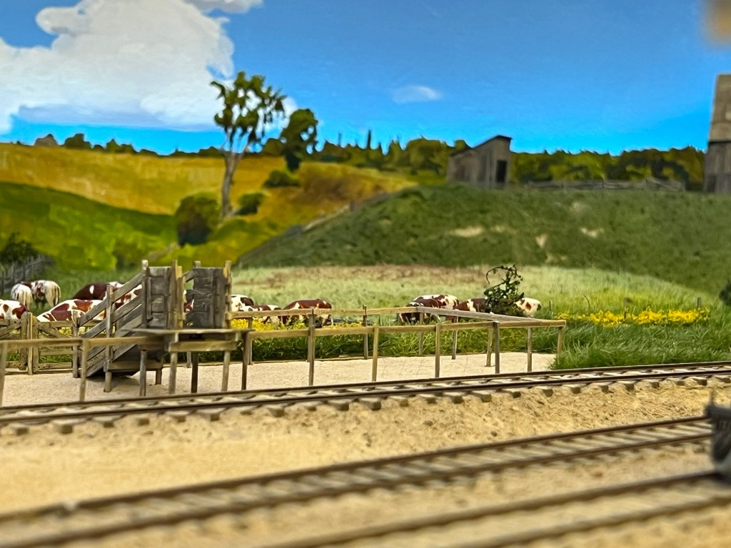 Typical line fences, such as the one at the edge of the pasture, or the fencing for the cattle pens, are a mesh of wires no more than 1.5 mm in diameter. That’s less than .02 mm in HO scale, or about a third of a human hair. I’ve always felt that modelling such a fence would be at best challenging and at worst chunky. And at 60 cm from the edge of the layout, most of them would be all but invisible anyway.