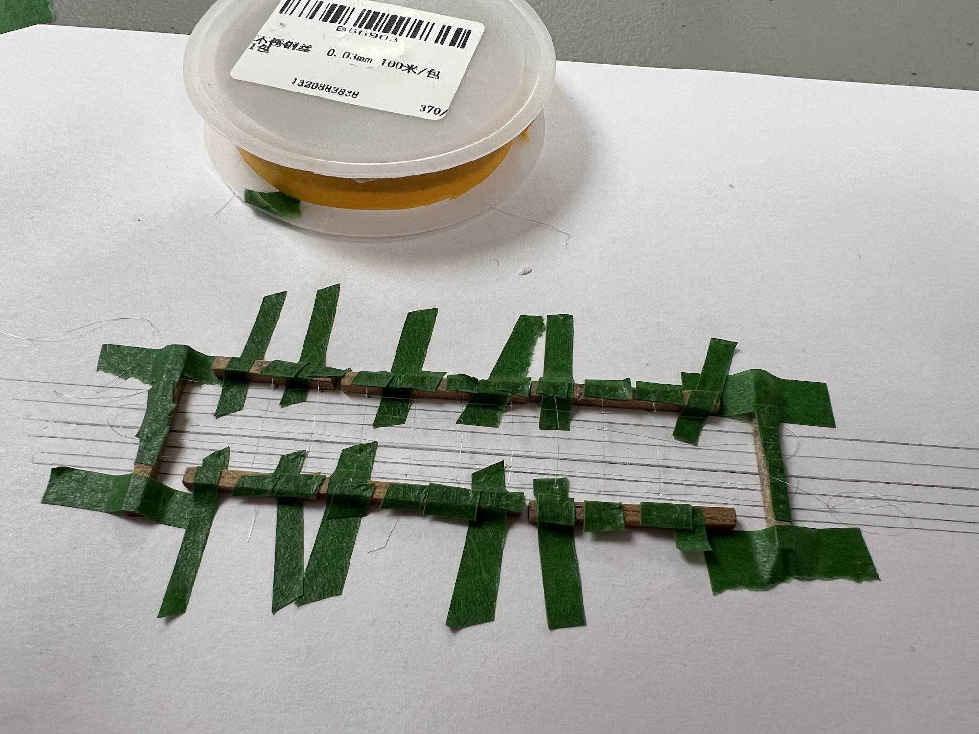 At first I tried taping some longer pieces of wire to a paper template, and knotting the verticals in place. After 20 minutes, I had made exactly one knot, and it wasn’t where it was meant to be. Rob suggested glue, and I rigged up some pieces of wood I had on hand to lift the wires off the surface of the paper. Then I wove uprights through the longer horizontal wires, and held everything in place with tiny squares of tape.