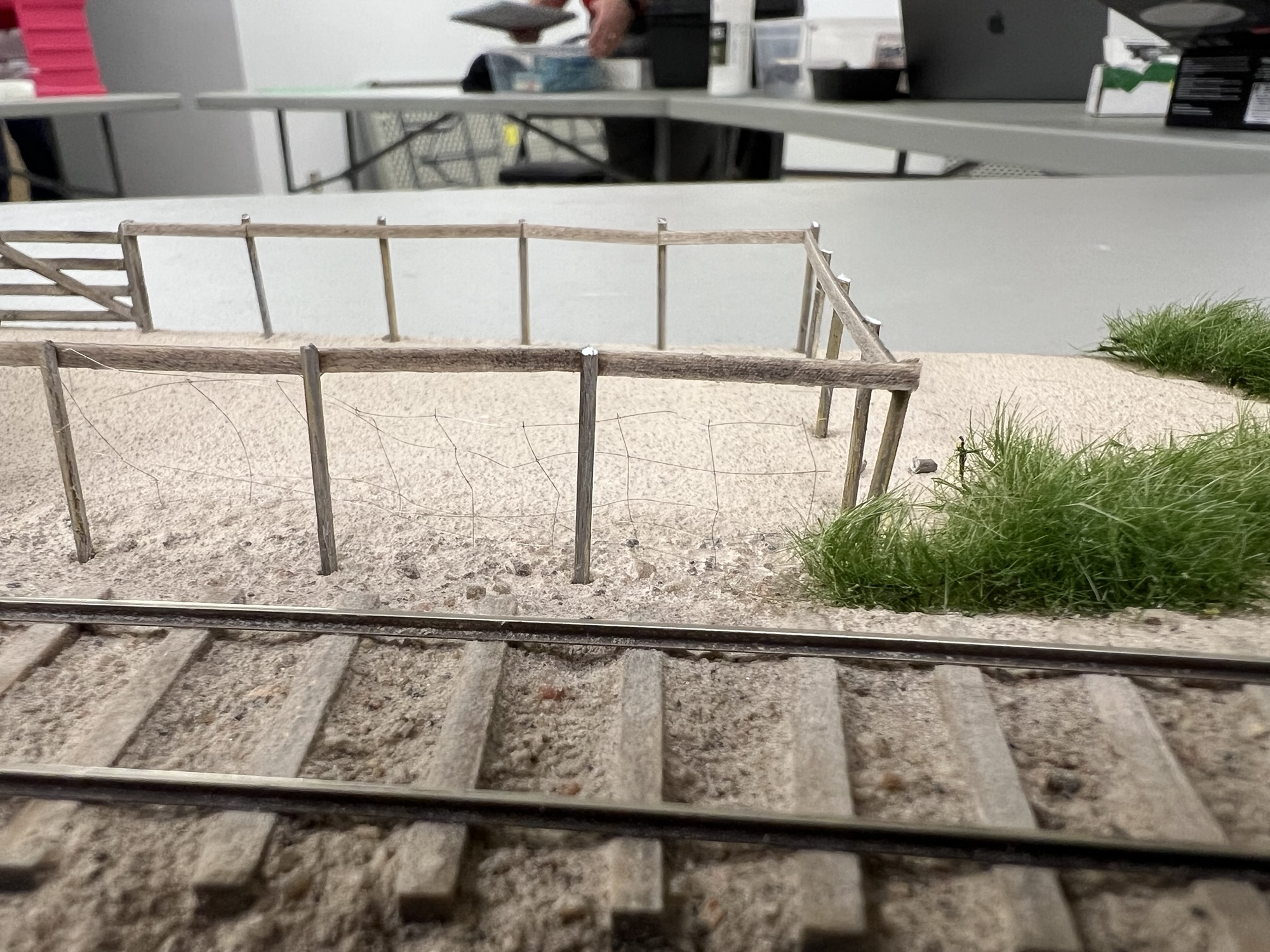 Typical line fences, such as the one at the edge of the pasture, or the fencing for the cattle pens, are a mesh of wires no more than 1.5 mm in diameter. That’s less than .02 mm in HO scale, or about a third of a human hair. I’ve always felt that modelling such a fence would be at best challenging and at worst chunky. And at 60 cm from the edge of the layout, most of them would be all but invisible anyway.