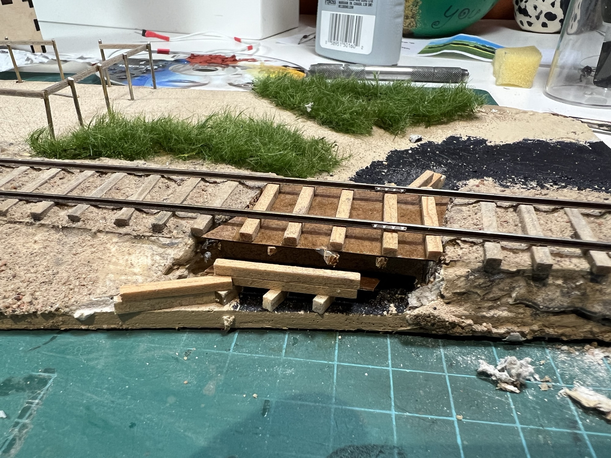 When I initially routed out the stream on the cattle spur module, I felt the roadbed was too low to allow for a culvert, and so, I chewed straight through the roadbed to make a space for a bridge. The rails flew over this chasm for months as I waffled on the bridge or culvert question. Unsafe for engines, but fortunately the switch is not yet in service anyway.