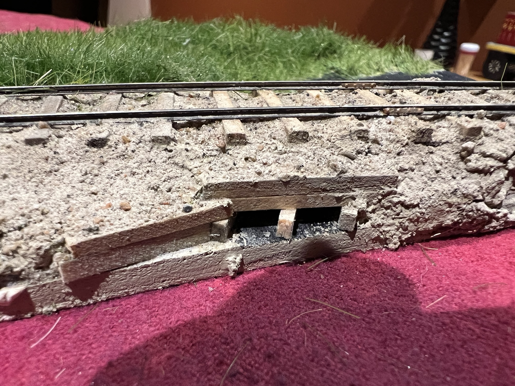 It wasn’t pretty, but it was pretty solid once the glue dried. Then I hid all the evidence (except I suppose for a photo now available on the Internet) with a layer of ground goop and covered it with ballast. There isn’t much room in the culvert for the spring freshet, but it looks pretty believable otherwise.