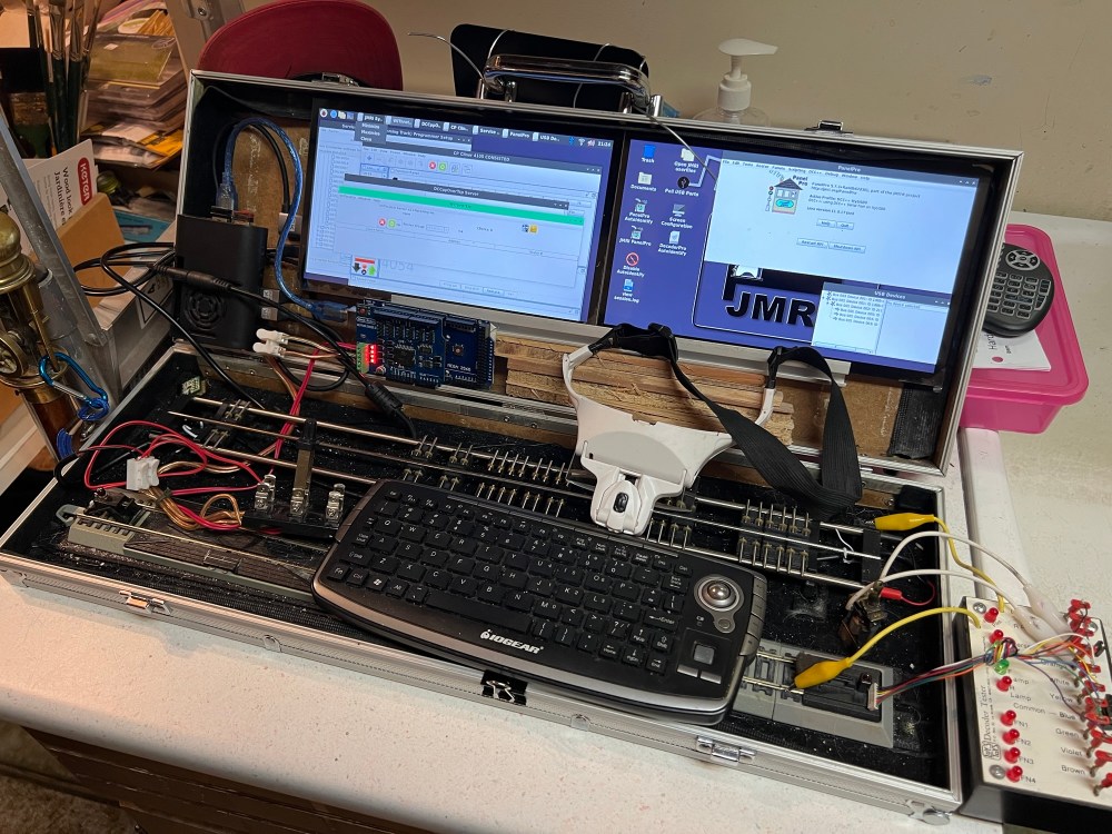Then on a counter around the corner, I found this work in progress by Dan MacDougall. It is a complete DCC test and programming track tucked into a repurposed poker chip case. The DCC system consists of a Raspberry Pi running JMRI (standing to the left end) and connecting to an Arduino running DCC-EX (below the left-hand screen). The project box on the right provides a rig for testing decoders. Even the keyboard with built-in track ball fits into the case. Dan plans to further refine the setup so everything fits and he can just show up at a friend’s house, plug it in and get straight to programming.