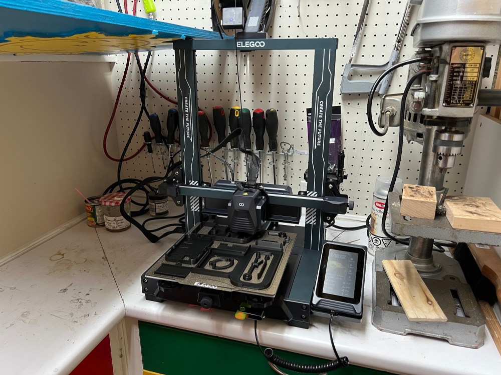 I often get asked about the fumes from the resin printer, and honestly, when the cover is on, nobody can detect them. The new FDM printer, on the other hand, smells like melting plastic when it’s running, and so after the initial test prints, it was banished to the increasingly crowded heavy shop where I can run the extractor fan. I’ll be building another cabinet for the 3D printers this spring.